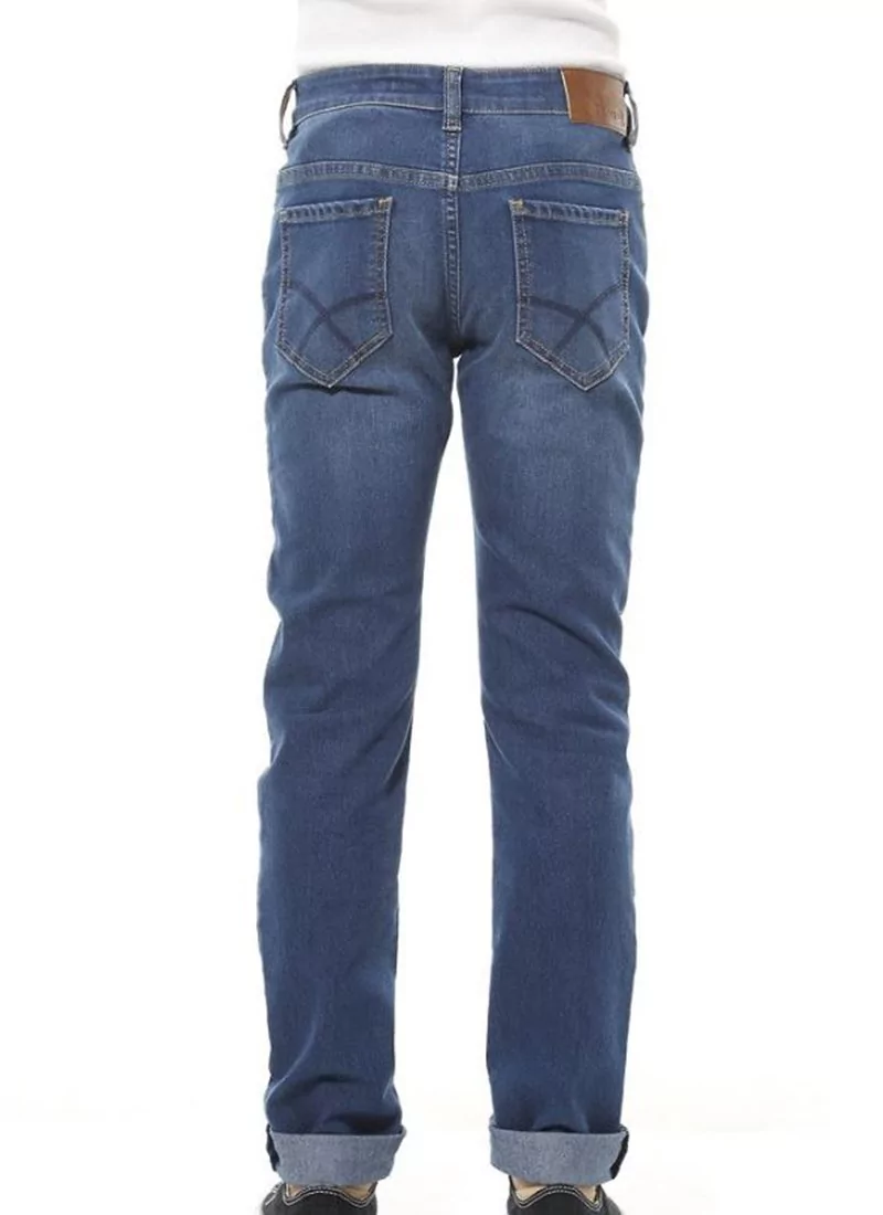 A mid-rise slim cut jean in a mid-blue stretch denim with a vintage wash.