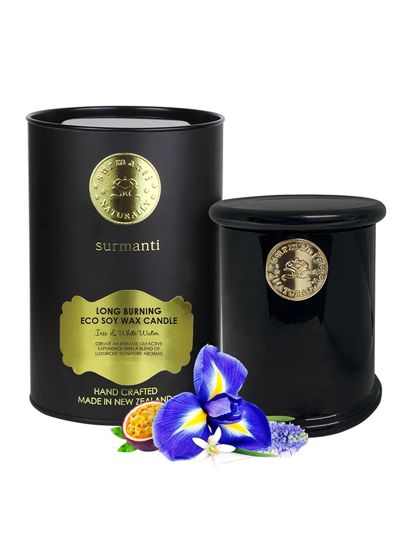 Light a flame, set the mood, and within minutes transform any living space with the cozy glow of our Surmanti long-burning eco soy candle. Inhale top notes of Blue Iris and Hyacinth, dropping into green mid-notes of Lemon Blossom and Melissa in a delicate Passionfruit base.