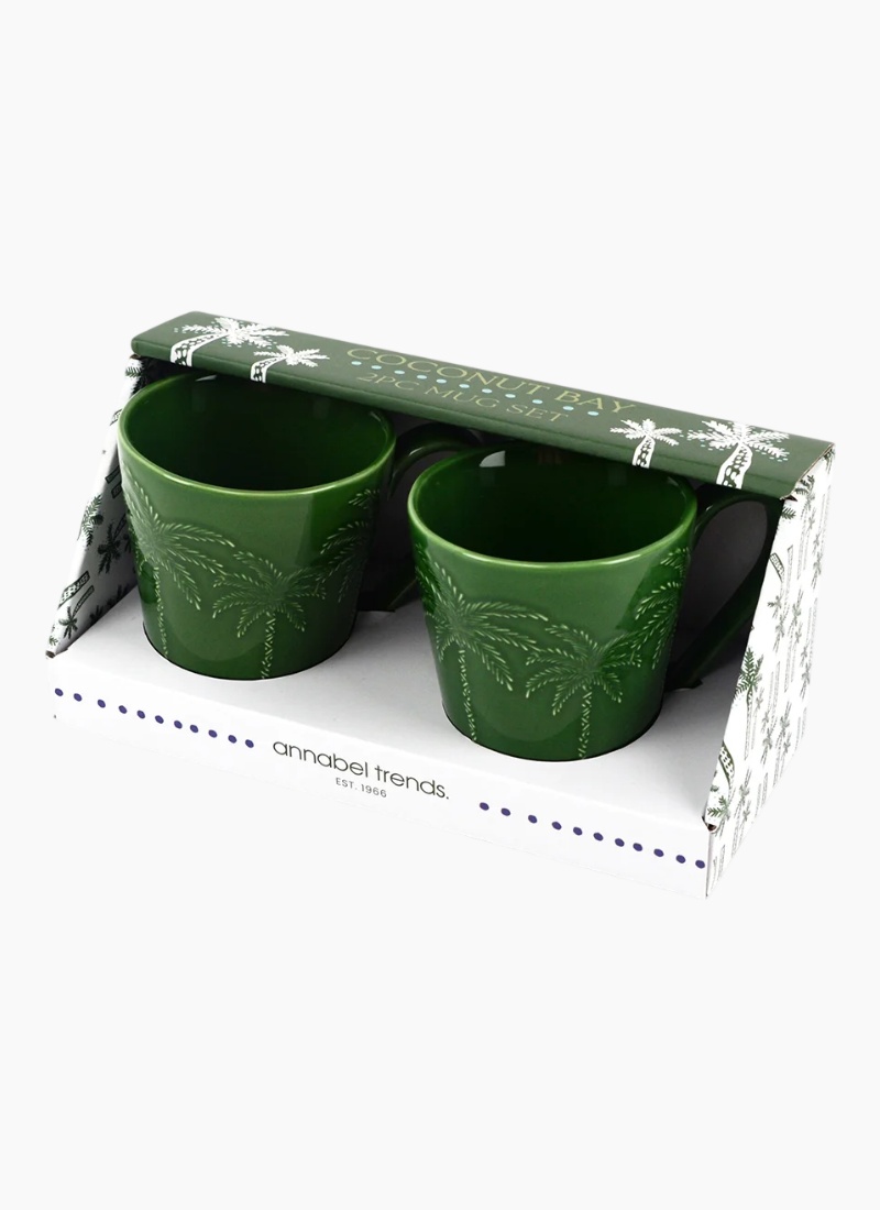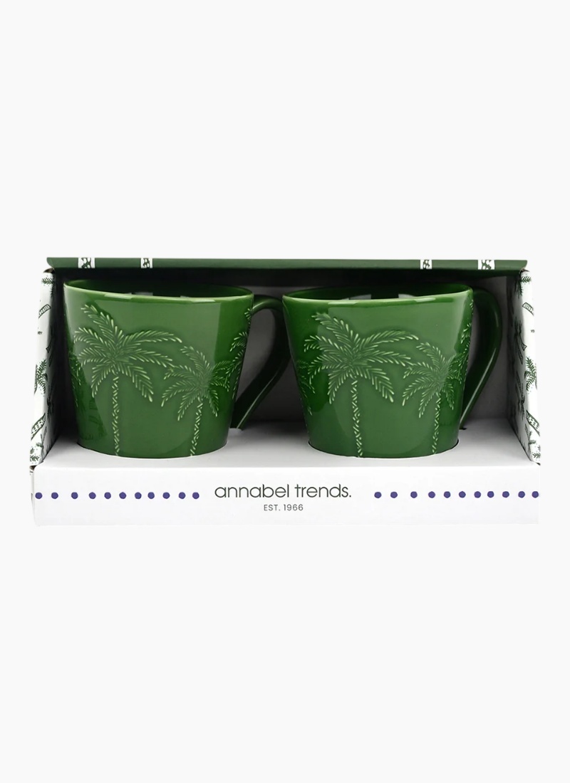 - Set of two glazed ceramic mugs in a rich green with an embossed palm motif for subtle texture