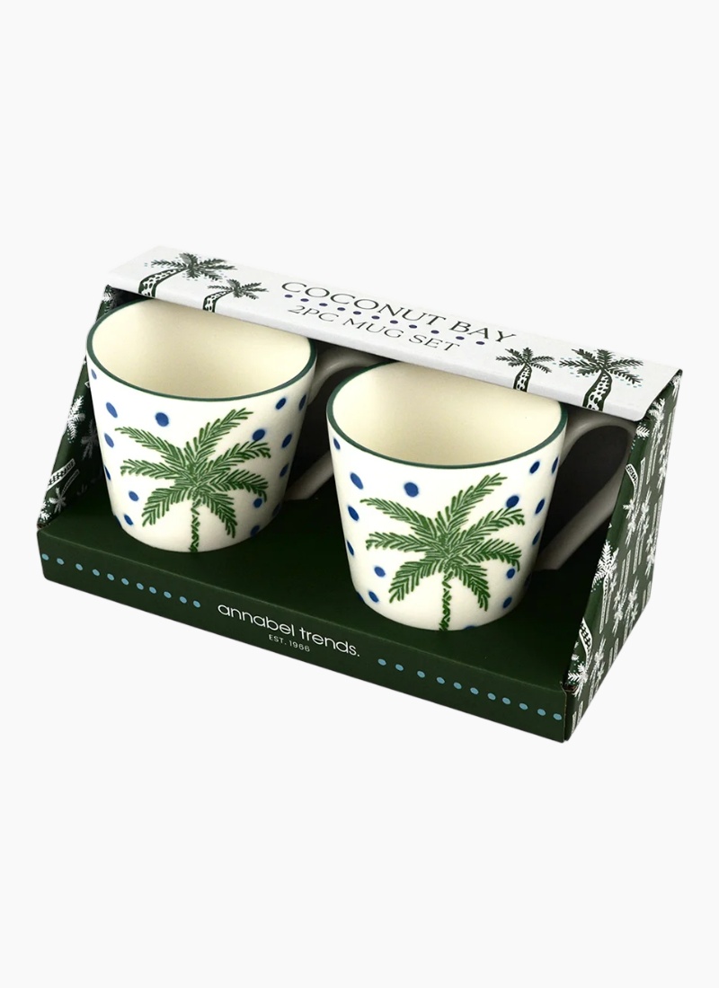 - Perfect for the Kitchen, these white ceramic mugs feature a green palm motif and playful blue spots for an instant coastal accent