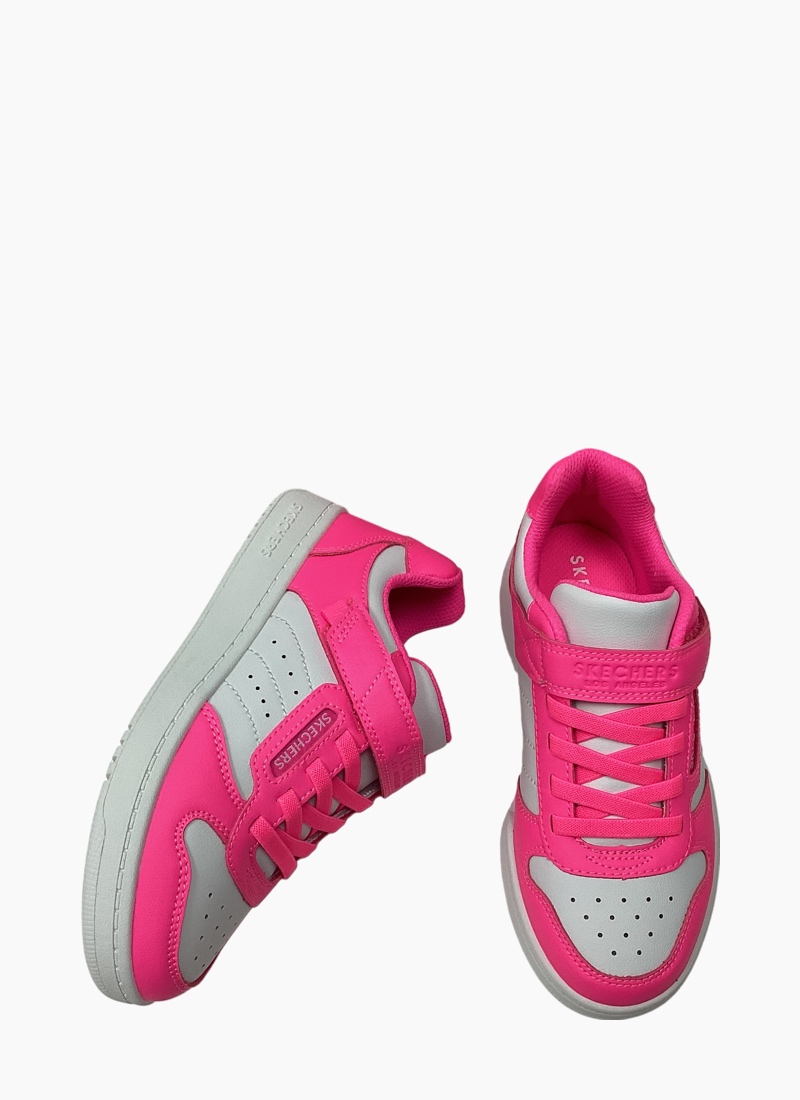 Alley-oop in comfortable court-style wearing Skechers Street™ Quick Street - Style Stride. This machine-washable low-top features a smooth duraleather upper with stretch laces, an adjustable instep strap, and a cushioned comfort insole.