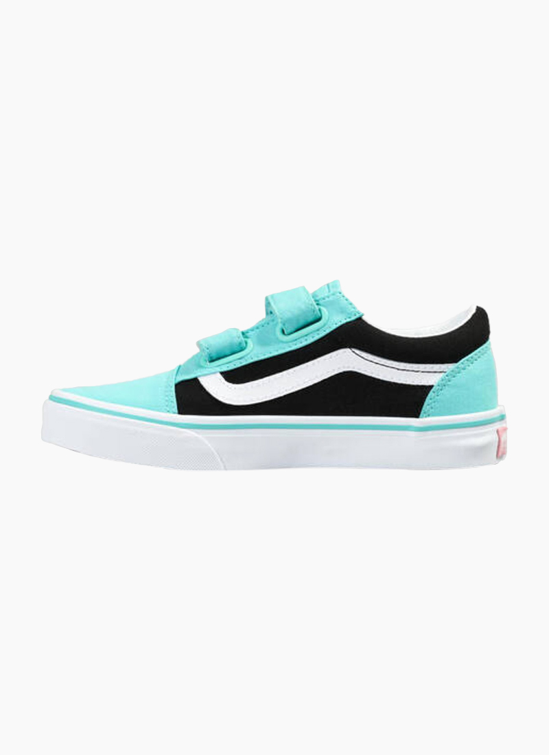 Strap Closures Create a kid Friendly Fit on this Iconic Sidestripe Shoe. The kids Old Skool V Glitter reimagines our iconic Sidestripe shoe by swapping traditional laces for double hook-and-loop closures. Featuring a colorful floral print enhanced with glitter, this low-top style maintains its classic appeal while providing an easy, secure fit that will keep your little one comfortable all day.