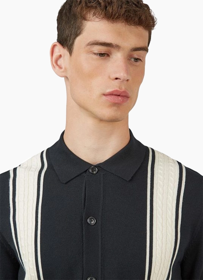 Button through front with contrast vertical cable stripe and tipping at the hem.