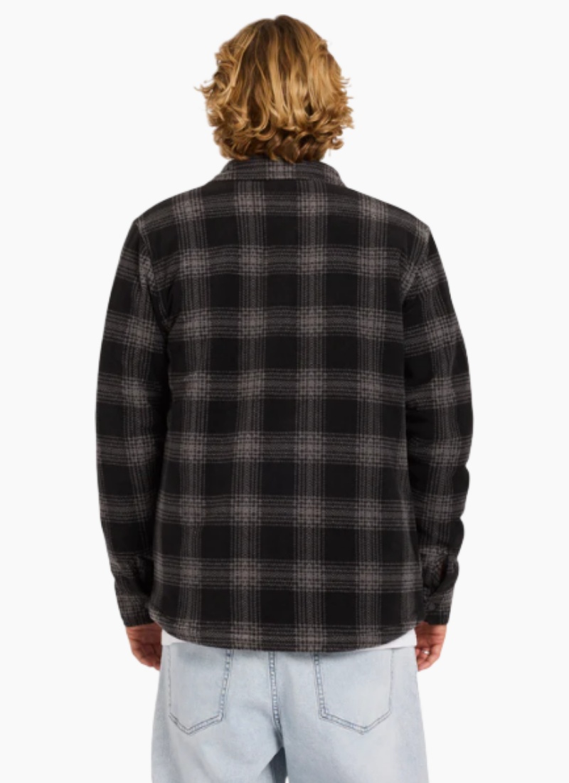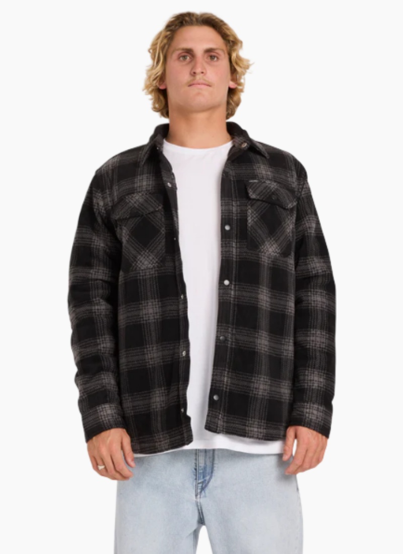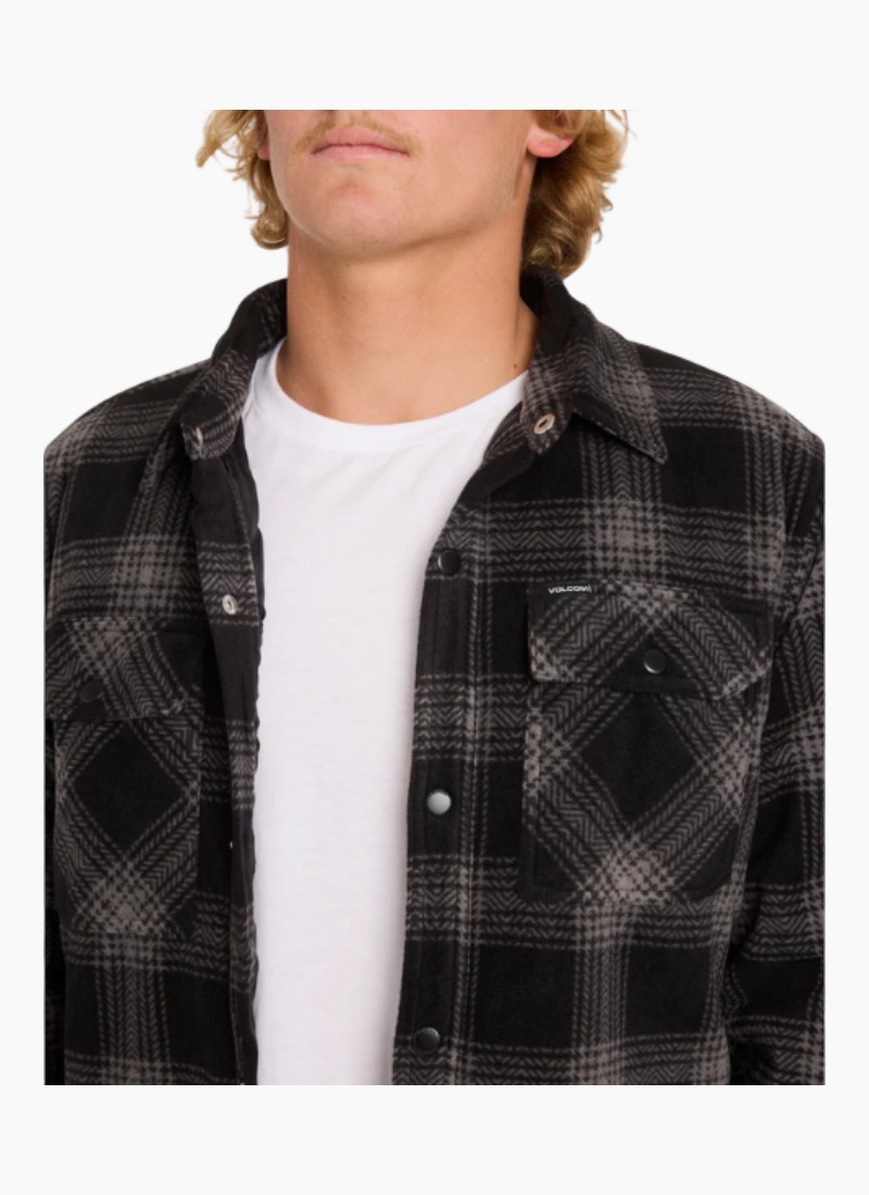 Introducing the Bowered Fleece Jacket from VOLCOM. This cosy black plaid men's jacket offers effortless layering and everyday street-ready warmth. Polar fleece shirt Quilted lining Snap front closure Chest pocket and side-entry hand pockets Logo embroidery and patch Branded metal trims