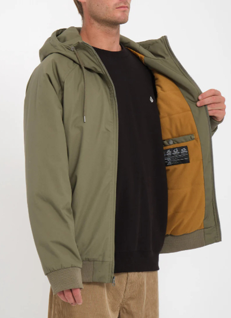Sustainable, warm and weather-ready, this recycled polyester jacket by Volcom boasts a water-resistant EcoElite finish, cosy insulation and practical pockets - ideal for chilly outdoor adventures.65% REPREVE Recycled Polyester / 35% Cotton oxford - WATER RESISTANT 10K - Teflon EcoElite™ Non-PFC DWR finish - Lining: 100% Polyester filled with 100% REPREVE Recycled Polyester polyfillHeavy weight hooded jacketWaist length and regular fitLined with brushed tricot and filled with Polyester fibersZip front closureHand pockets lined with brushed tricotInternal pocketStone embroidery at chest and Volcom flag label