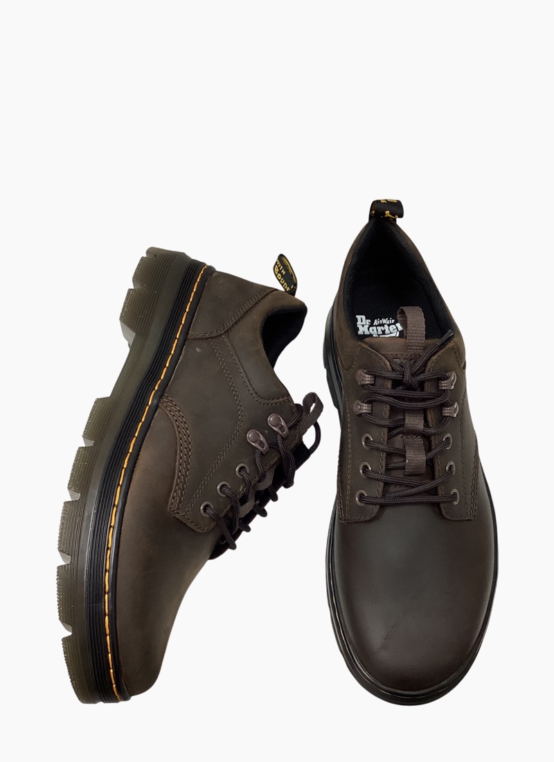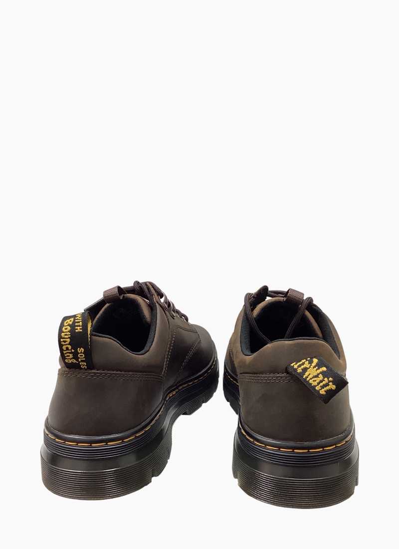 Built for everyday. Standing on an extra rugged luggy outsole and full of Docs DNA. Fitted with hiker style laces and finished with yellow stitching and a black and yellow heel hoop.
