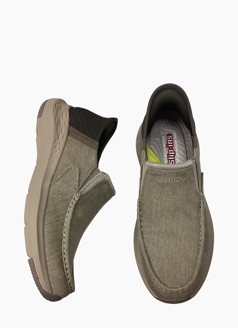 Simply step in and go wearing Skechers Hands Free Slip-ins® Relaxed Fit®: Parson Dewitt. Designed with our Heel Pillow®. This laceless style features a canvas upper with twin gore panels for ease of wear, a Skechers Air-Cooled Memory Foam® comfort insole and Goga Mat Arch™ cushioning for added support.