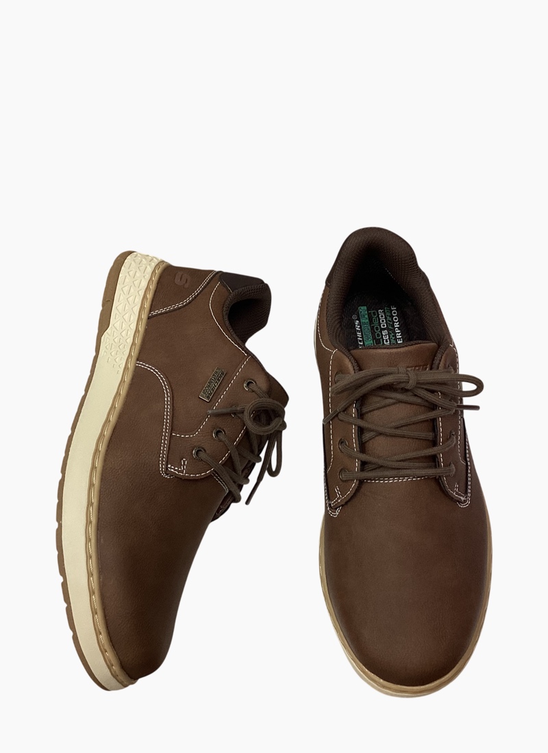 Classic style and comfort arrives in Skechers Relaxed Fit®: Garlan - Pryor. Featuring a waterproof lace-up vegan leather upper with a charcoal-infused Air-Cooled Memory Foam® insole and Skechers Goga Mat Arch cushioning for added support.