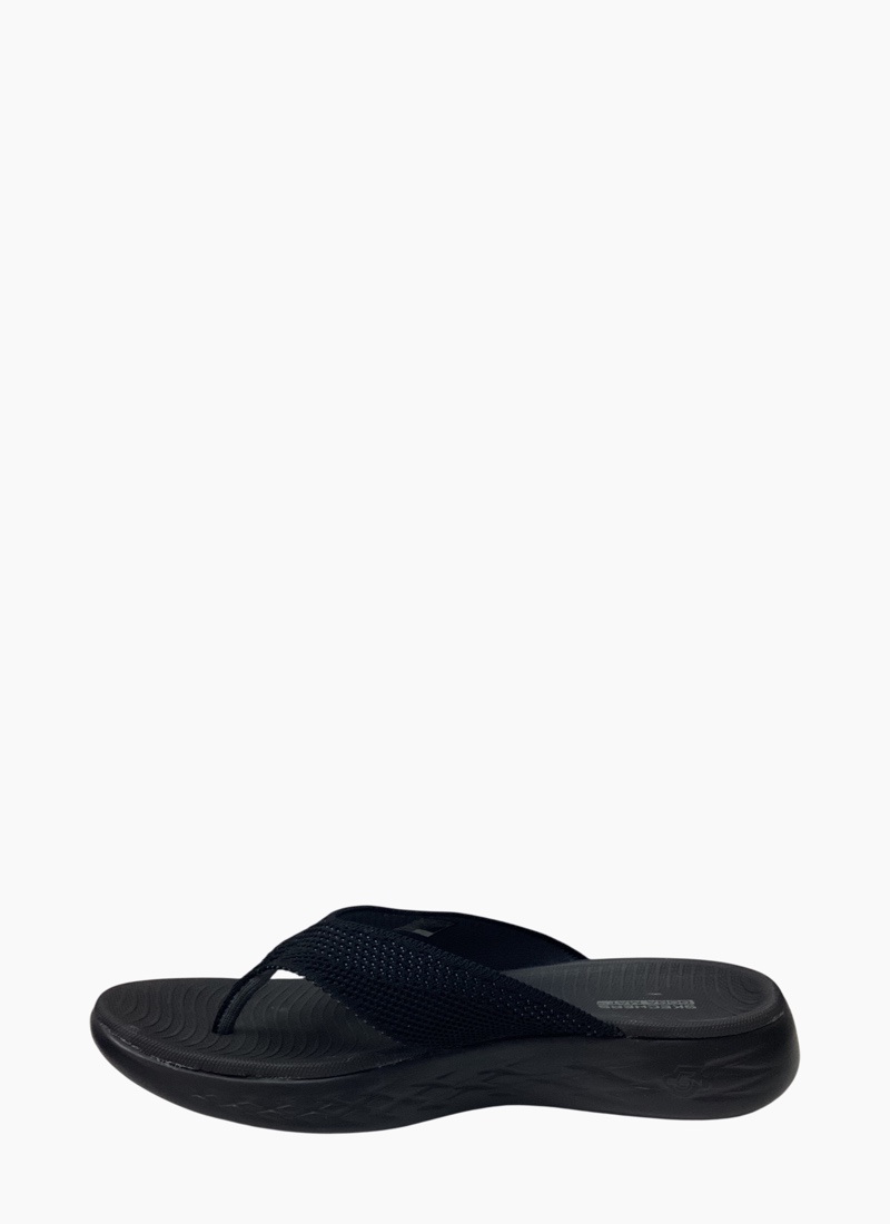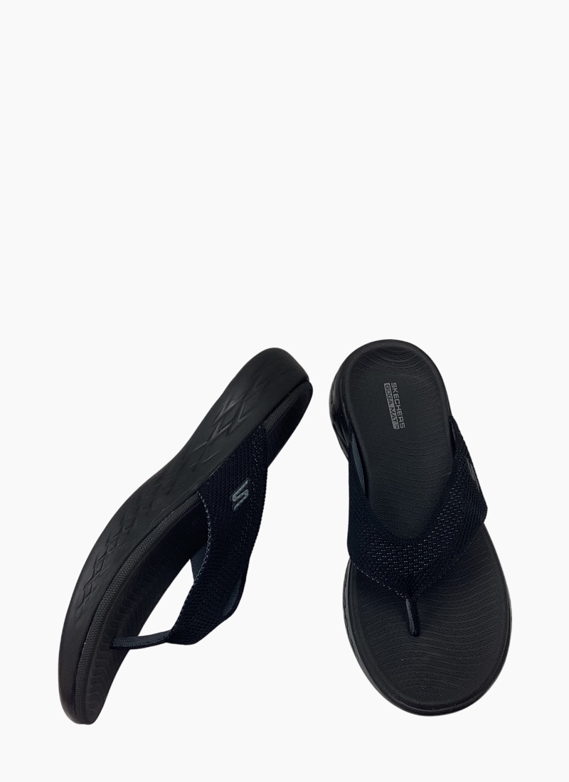 Walk with warm-weather style and comfort wearing Skechers On-the-GO® 600 - Flourish. This sporty 3-point thong sandal features a soft two-toned woven mesh upper, supportive contoured Goga Mat® footbed design and lightweight 5GEN® cushioning.