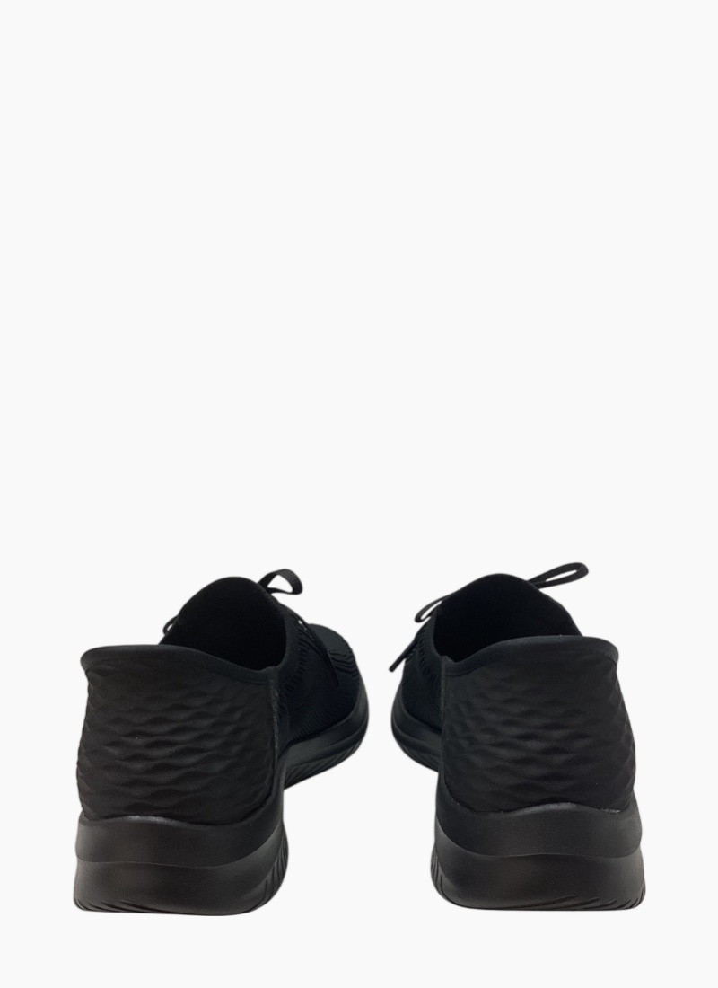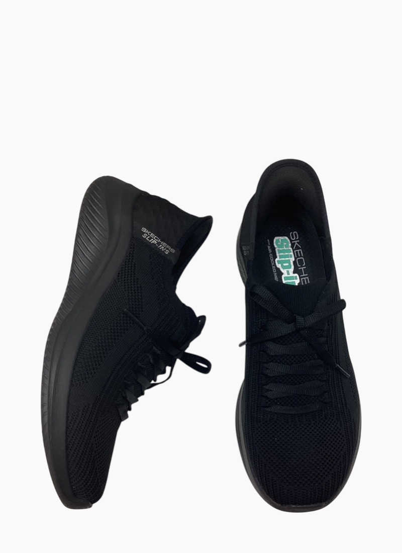 Introducing the Skechers 149710 Ultra Flex 3.0 - Brilliant Path Sneaker. A sleek black sneaker that blends breathable knit comfort with cushioned everyday support.