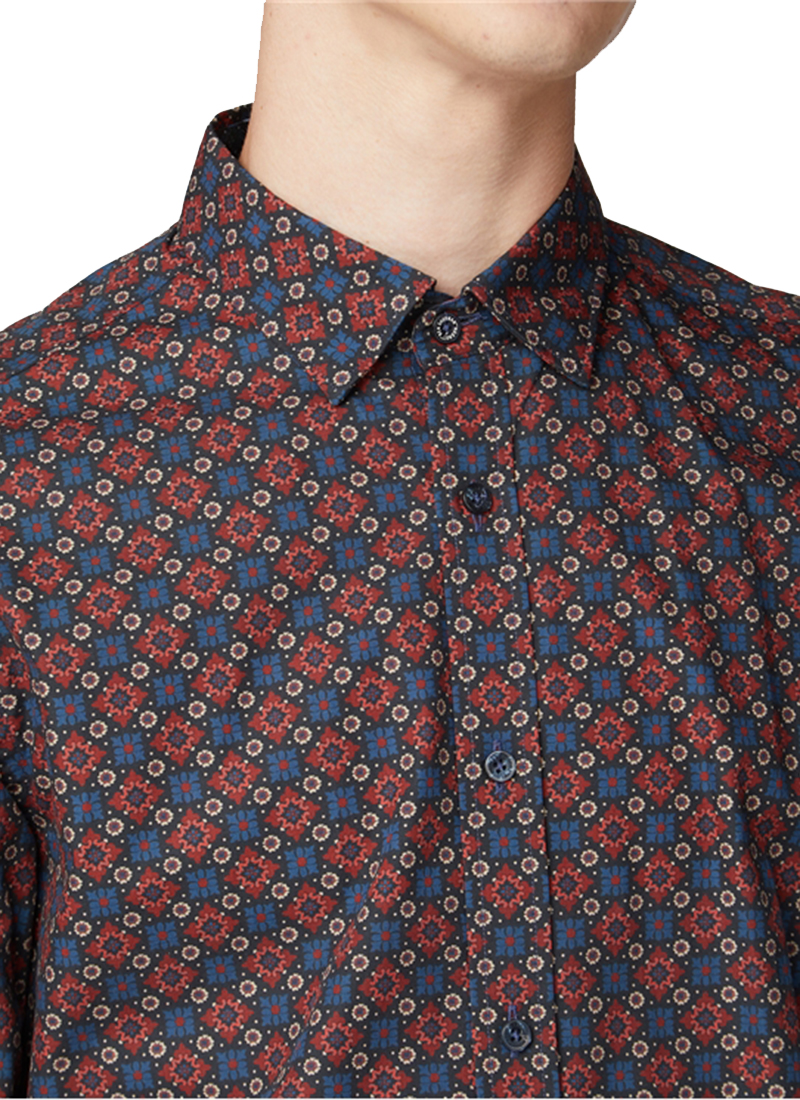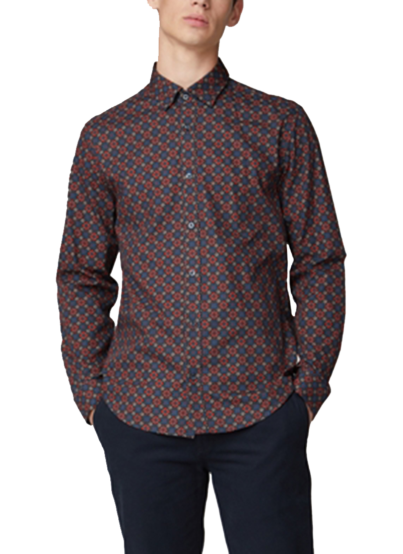 This rust brown and blue foulard print shirt by Ben Sherman is a unique addition to any wardrobe, inspired by retro menswear with a button up front and a concealed button down collar.