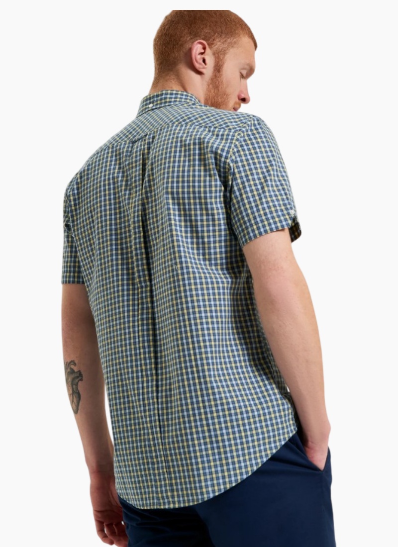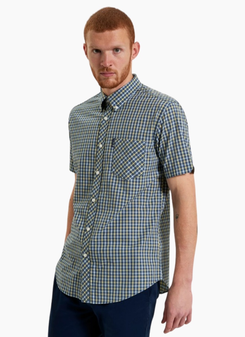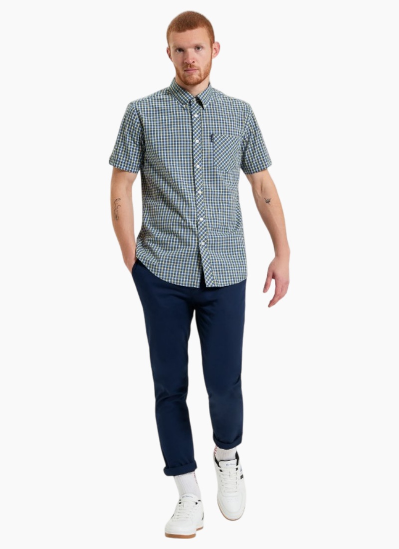 Step into a wardrobe classic with the Signature House Check Short Sleeve Shirt. Crafted from 100% organic cotton, this shirt blends heritage style with modern ease. Its signature house-check pattern delivers timeless appeal, while the two-finger button-down collar adds structure. The regular fit feels comfortable and flattering, and the chest pocket with woven “Ben Sherman” label adds that finishing touch of identity. Perfect for warm days, relaxed office looks, or weekend layering—this shirt brings bold style with effortless confidence.Two Finger Button Down Chest Pocket 7 Button Placket