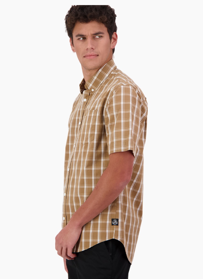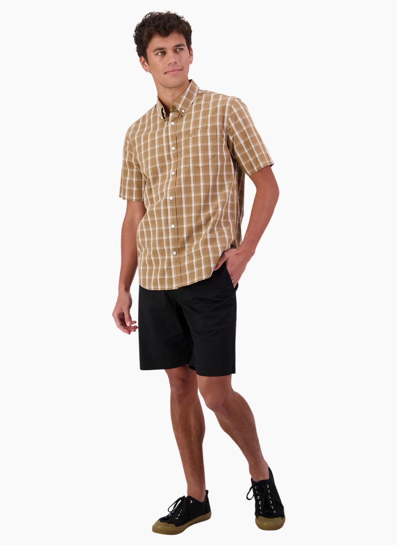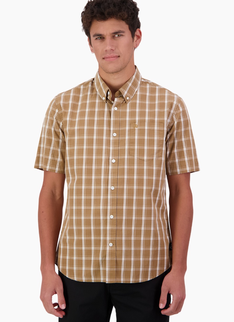 - Made from breathable cotton in a tan checked pattern, offering comfortable all-day wear