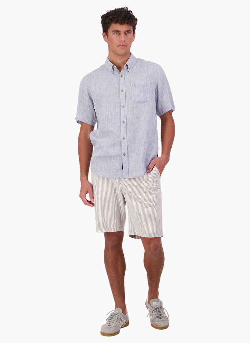 Made with 100% linen fabric, the Humber is the classic fitting, laid back shirt option of the summer to take you from beach to BBQ.Main: 100% linen, 143gsm Classic fit Button down collar Contrast inner yoke Chest pocket Triangle cut out with button detail at sleeve hem Brown tortoiseshell buttons Swanndri embroidery