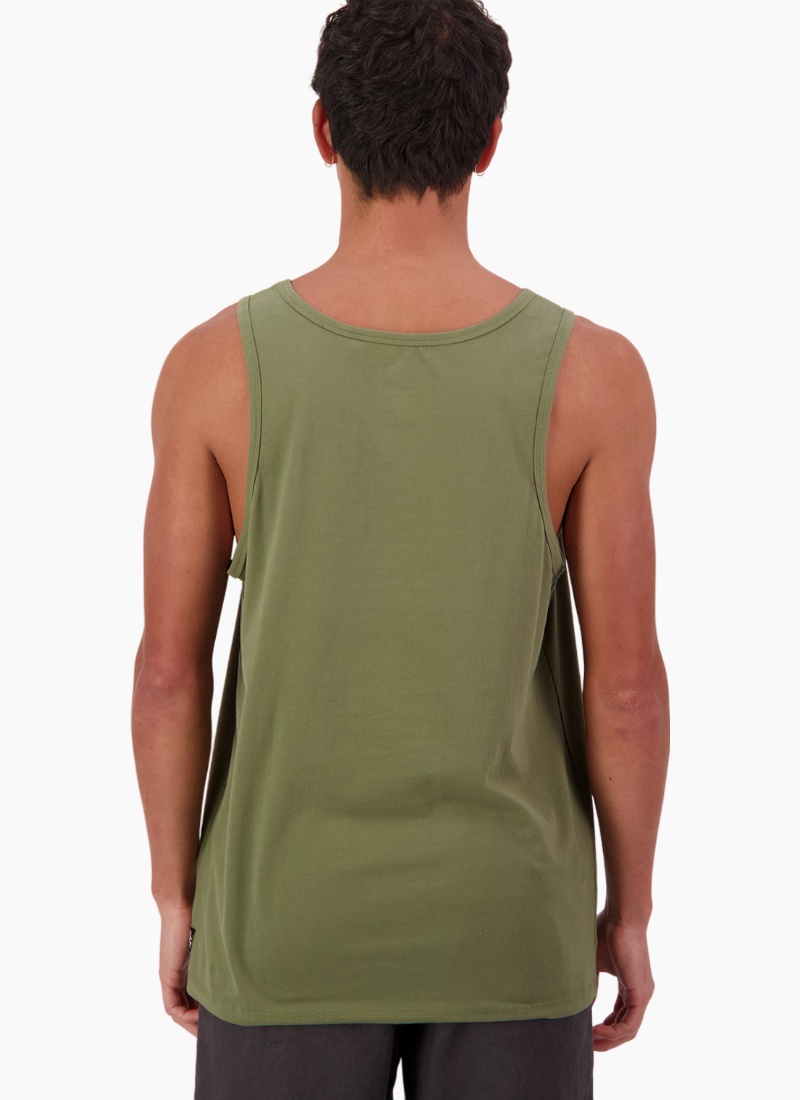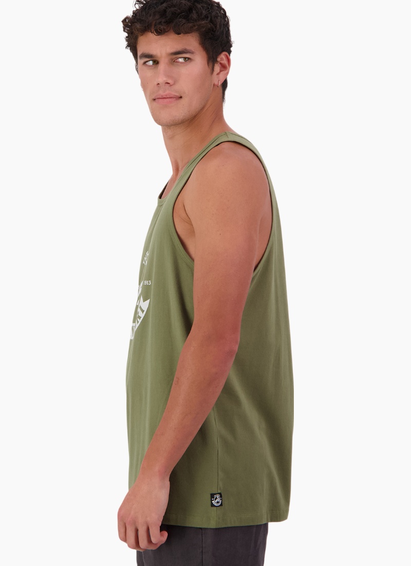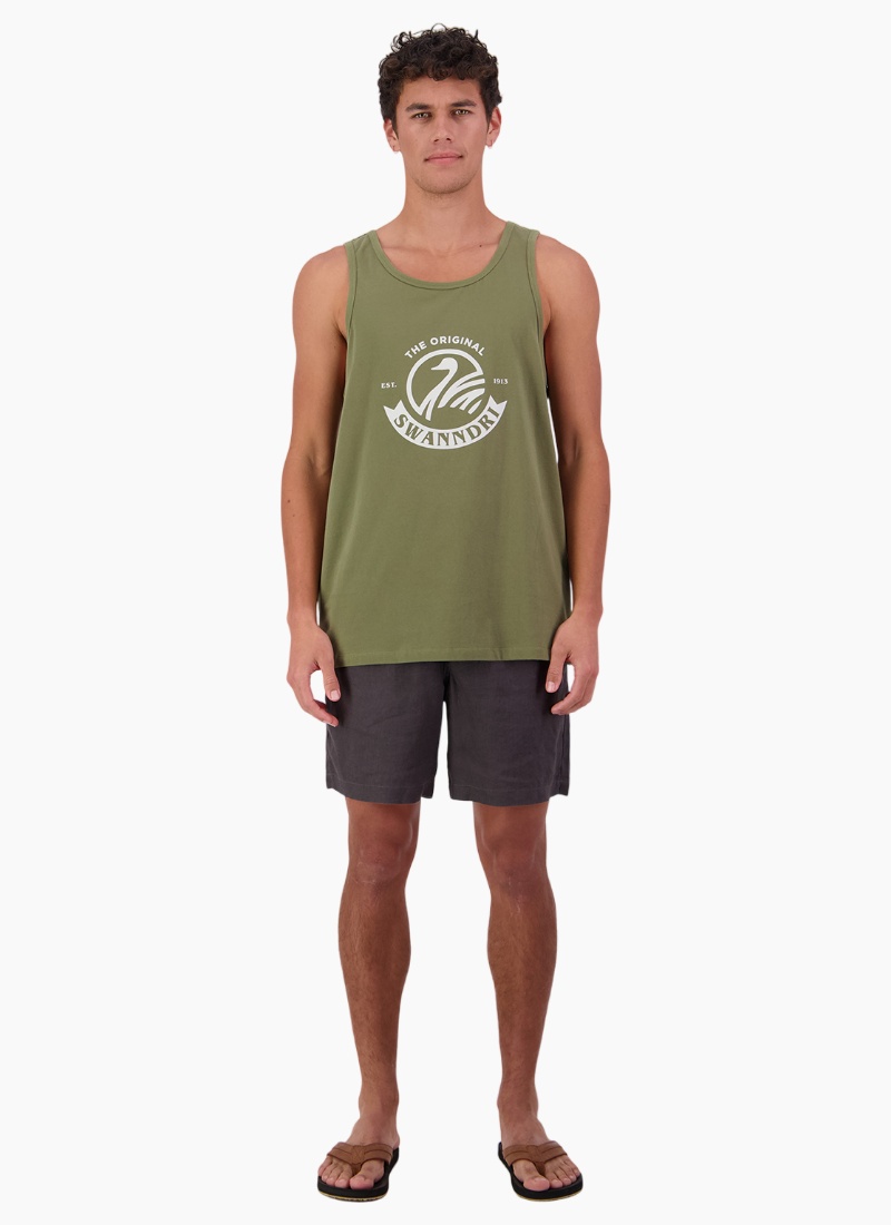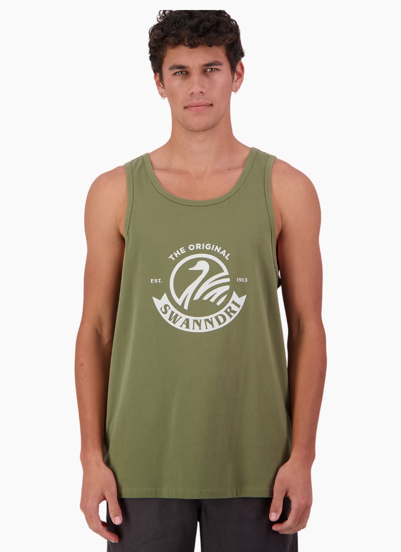 Introducing the Original Printed Singlet from Swanndri. This relaxed, heritage-inspired singlet in olive features a bold white logo print for a classic outdoor look.