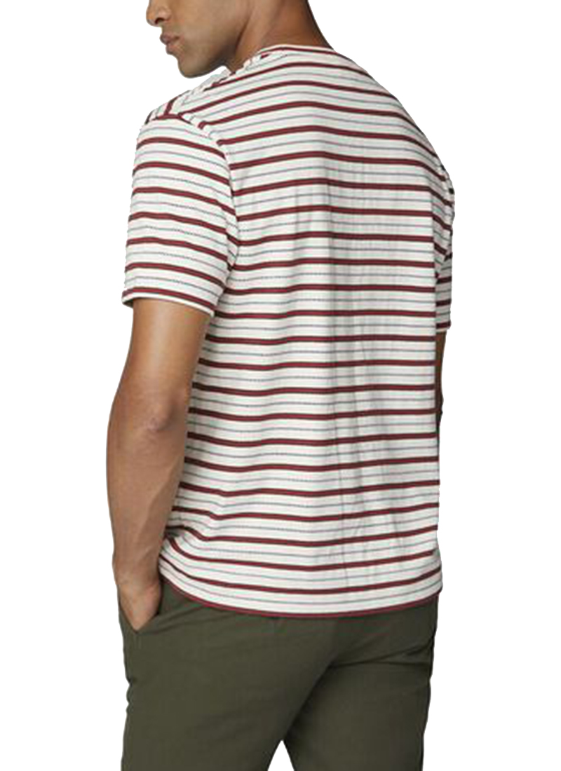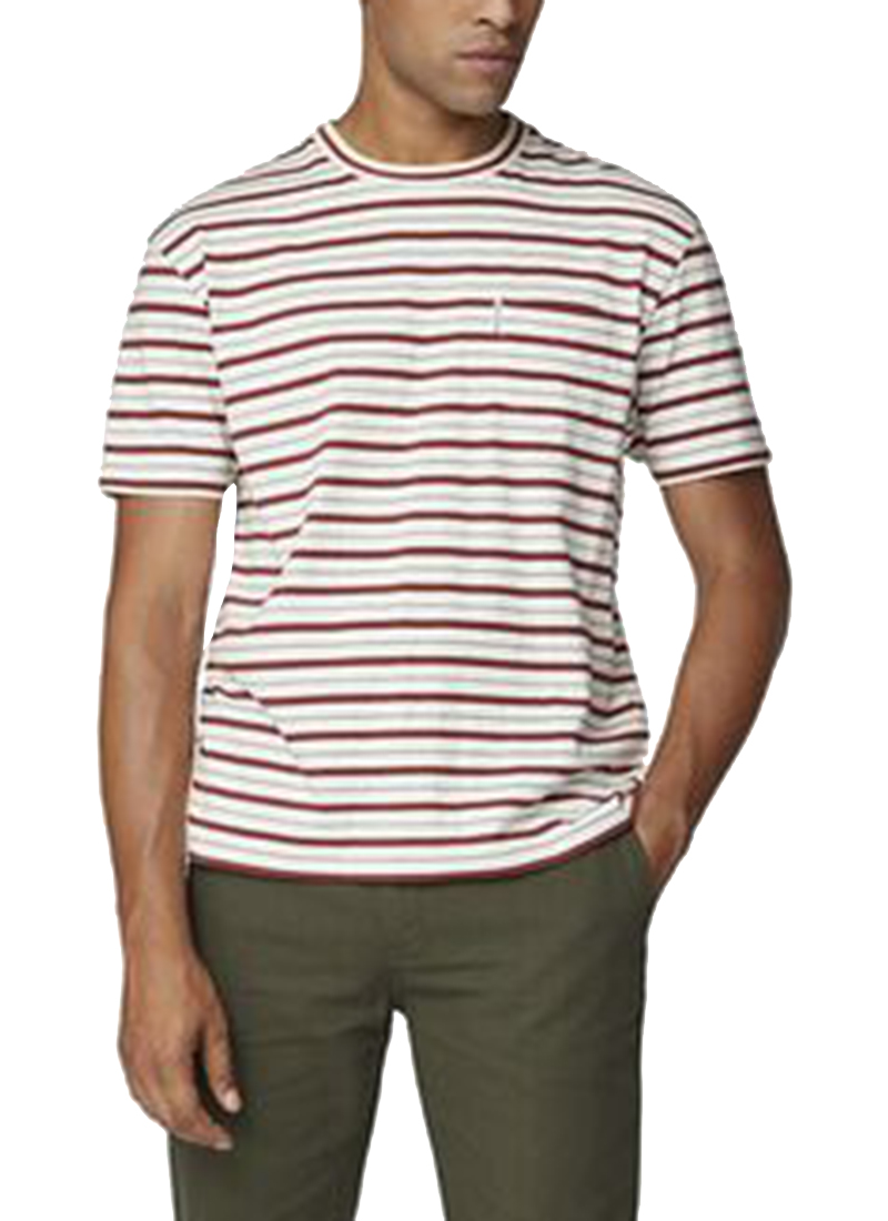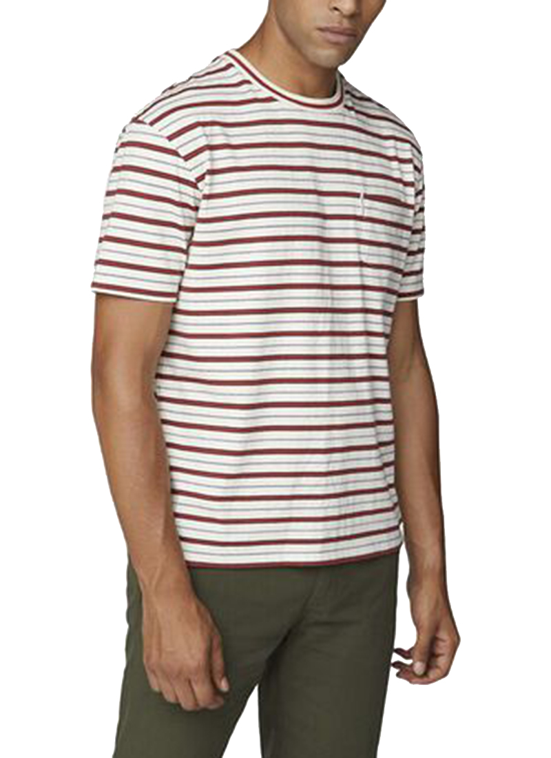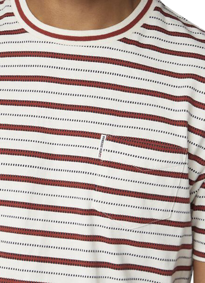 Jersey tee, with a textured yarn dyed stripe and a chest pocket on the left hand side with flag label branding.