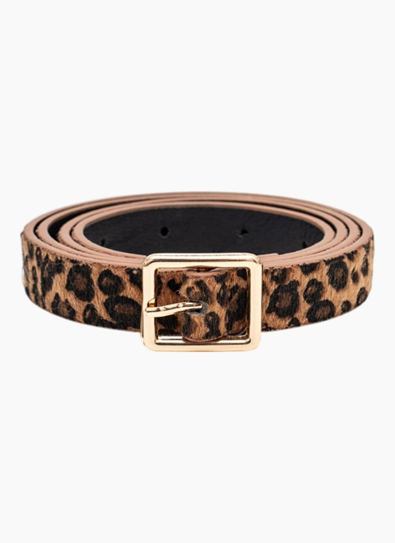 - Distinctive tan and black leopard colourway paired with a gold-toned square buckle for elevated detail