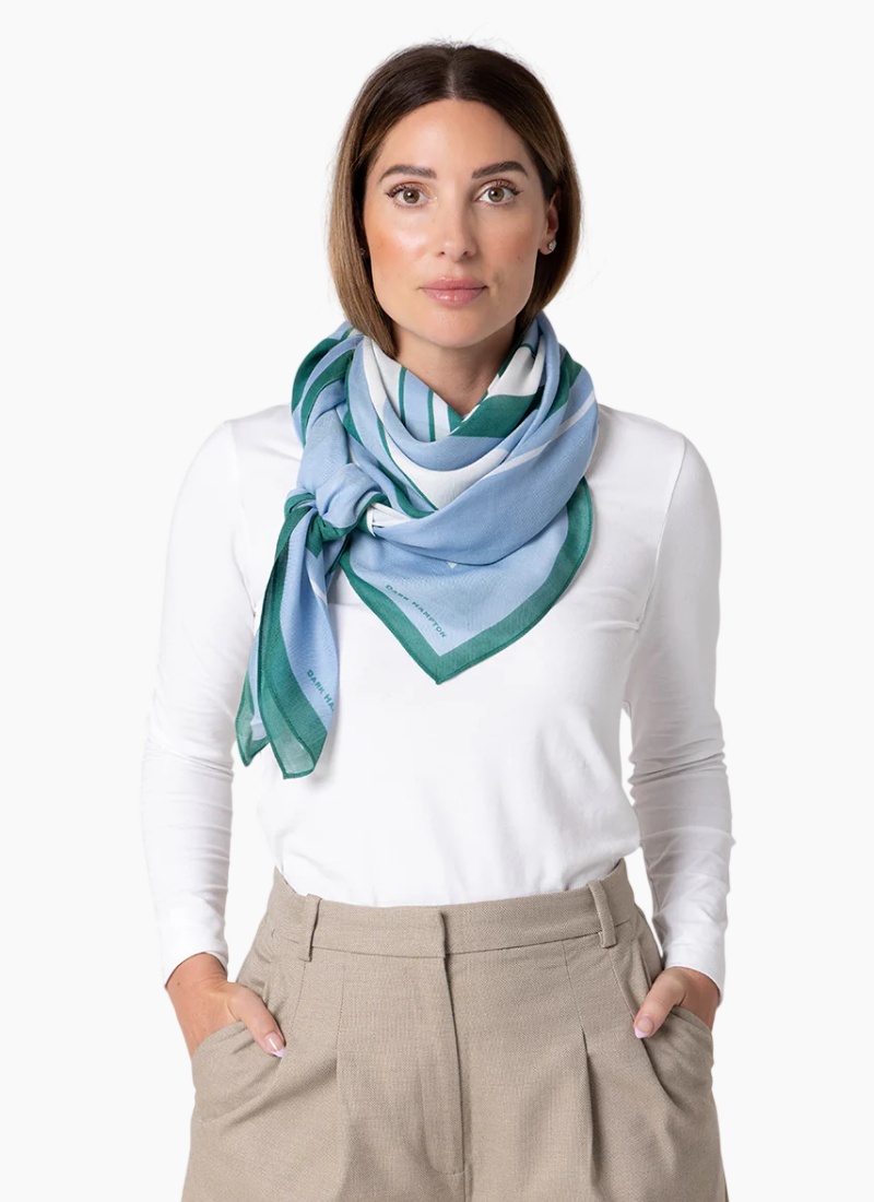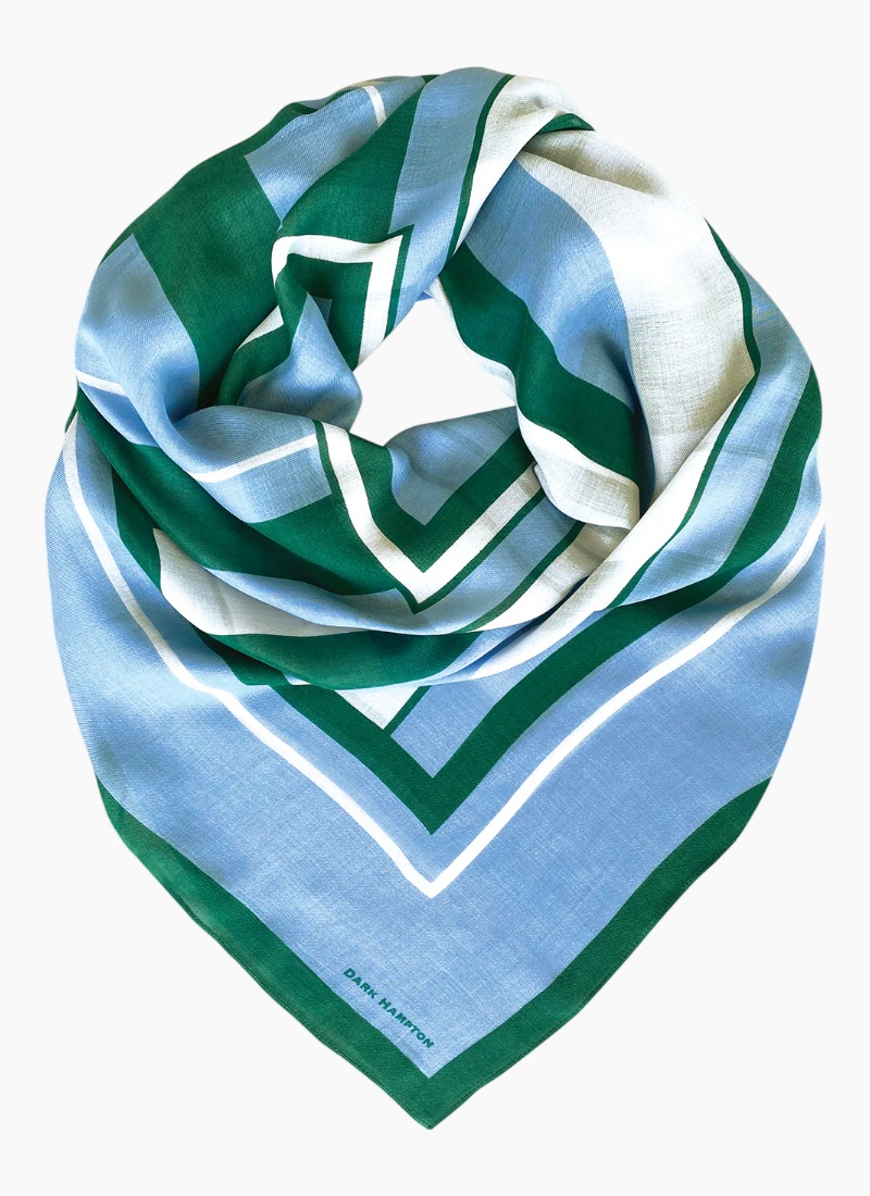 Featuring bold geometric stripes in shades of blue, green and white. It's the perfect statement piece for any season. Lightweight and soft feel Dimensions are 120x120cm Our scarves are delicate and should be handled with care. They are handmade and each one is slightly unique. Delivered in an elegant reusable gift bag.