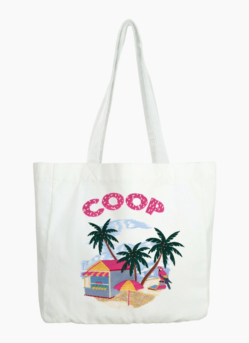 - White/Pink from COOP. This roomy canvas tote brings playful, beach-ready charm to every summer outing.
