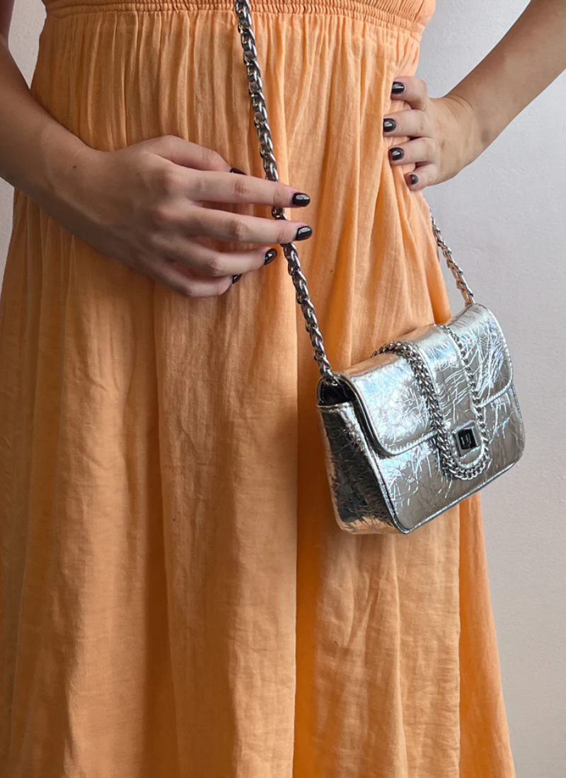 - Elegant silver colour and structured silhouette hold daily essentials with a luxe, evening-ready feel