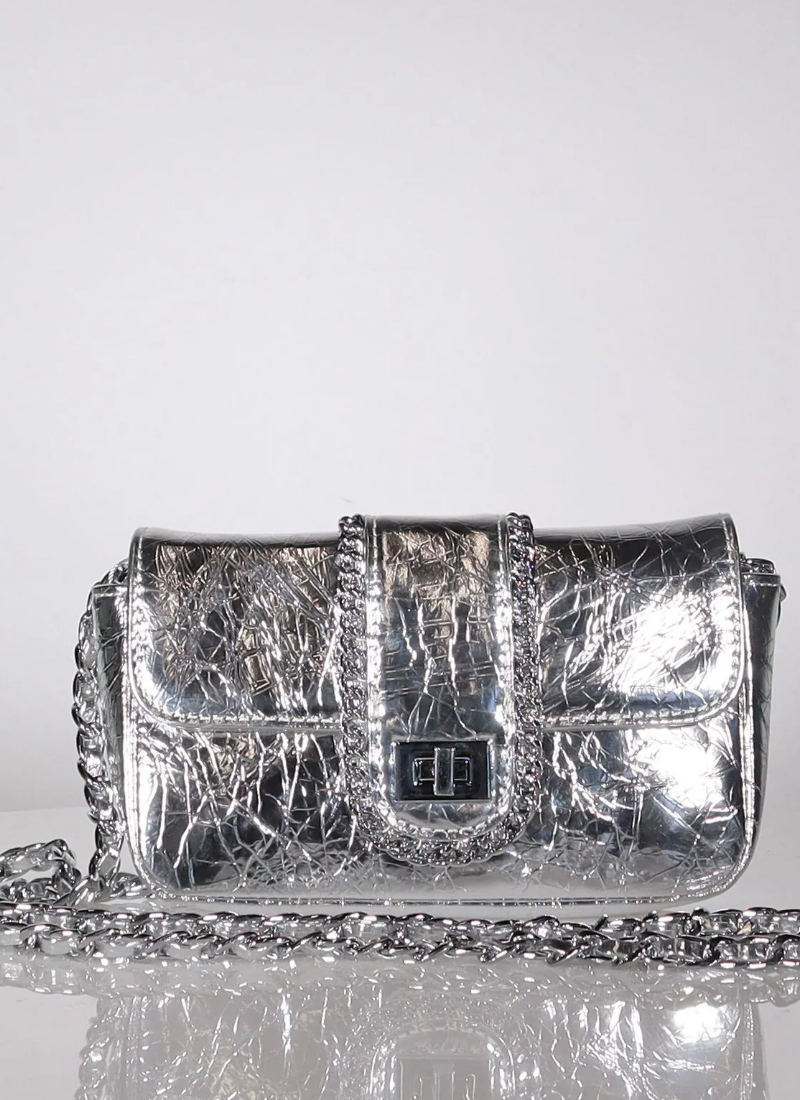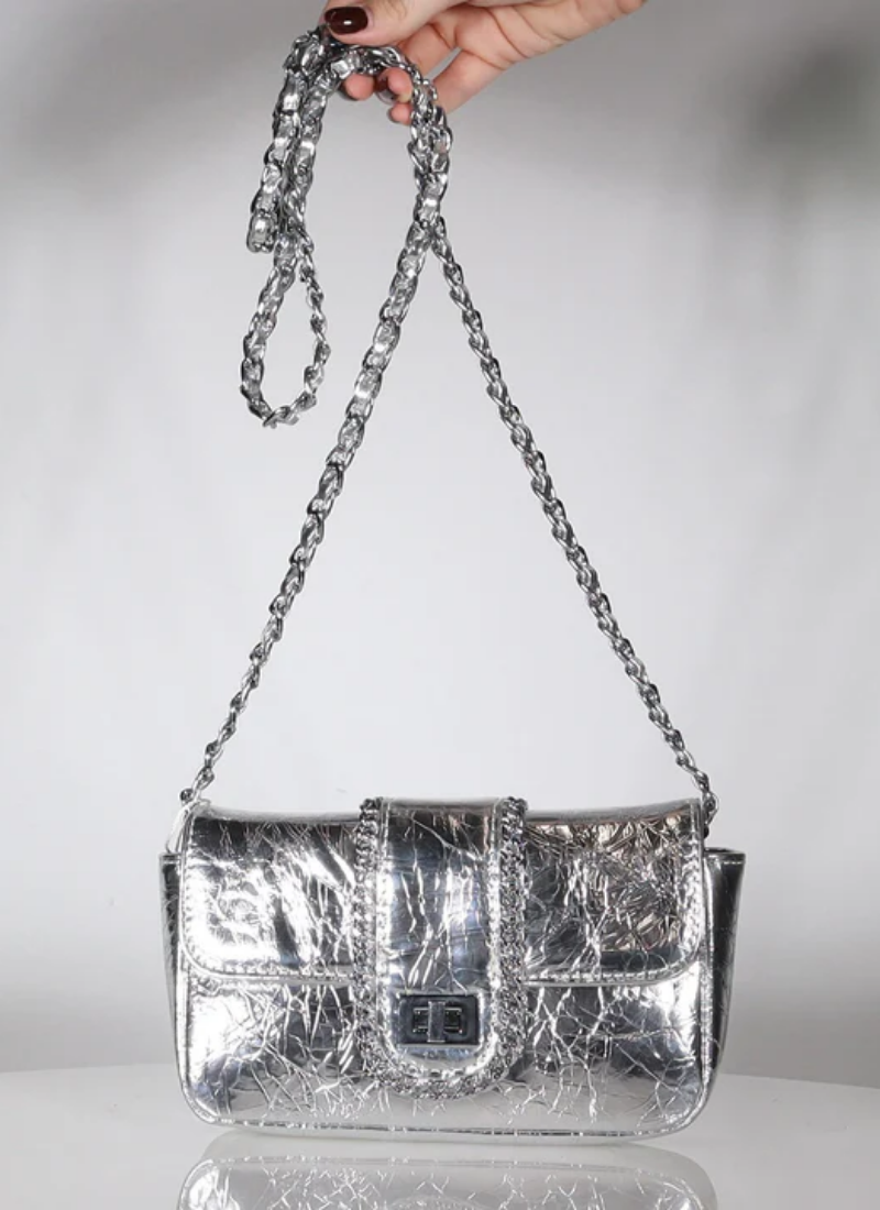 Introducing the Cosmic Diva Silver Scrunch Bag from Minx. This compact metallic shoulder bag adds instant statement polish to any outfit.