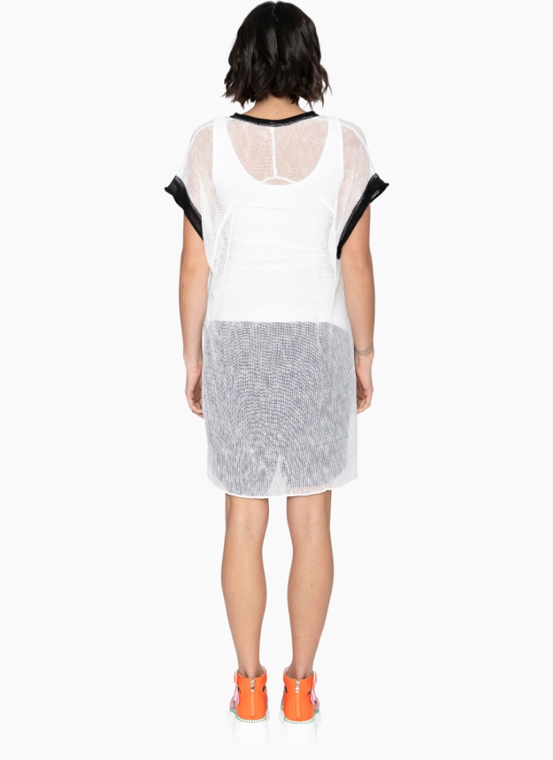 - Semi-sheer white colour with contrasting black trim at the neckline and sleeves for modern graphic detail