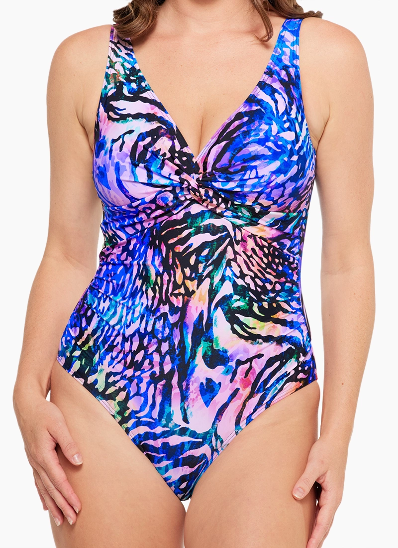 A quintessential TOGS v neck one piece swimsuit with a twist, designed for a flattering fit. This is a summer staple.
