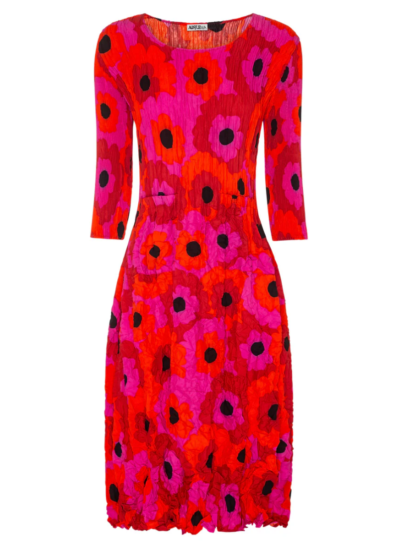 A celebration of colour and movement, the Smash 3/4 Sleeve Dress is a true statement piece. Crafted using Alquema's signature crush pleat technique, the vibrant printed fabric sculpts the body without restriction and creates visual depth with every fold. Whether layered or worn alone, this printed dress is perfect for those who dress with confidence and creativity.100% Reverse Satin, man made fibre Size 1 = 8-12 Size 2 = 12-16