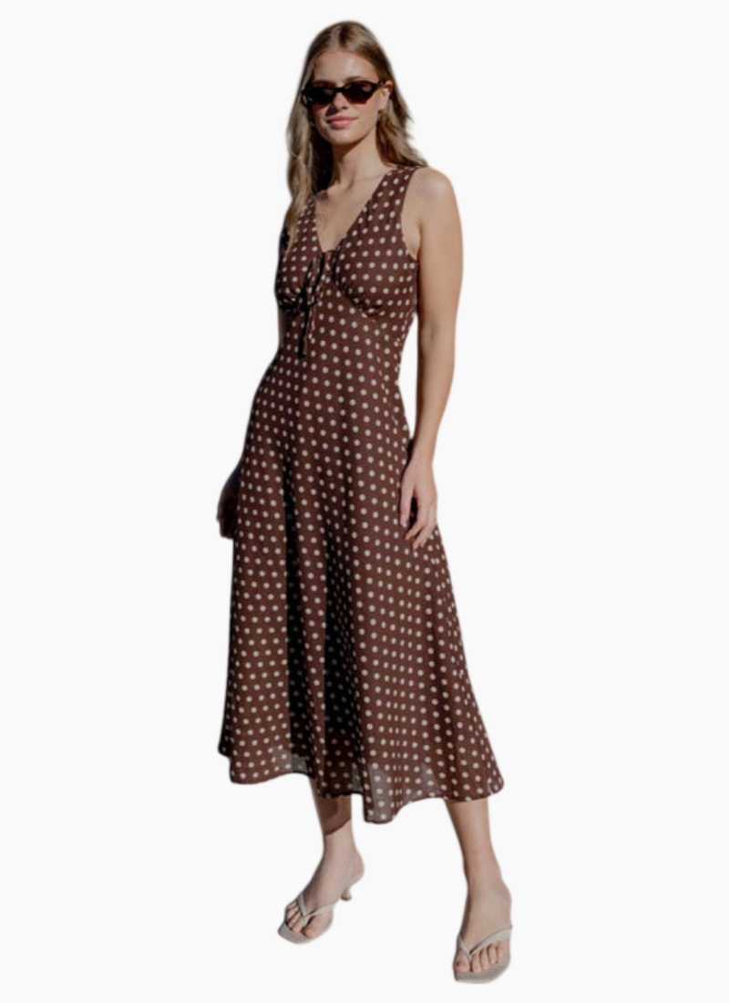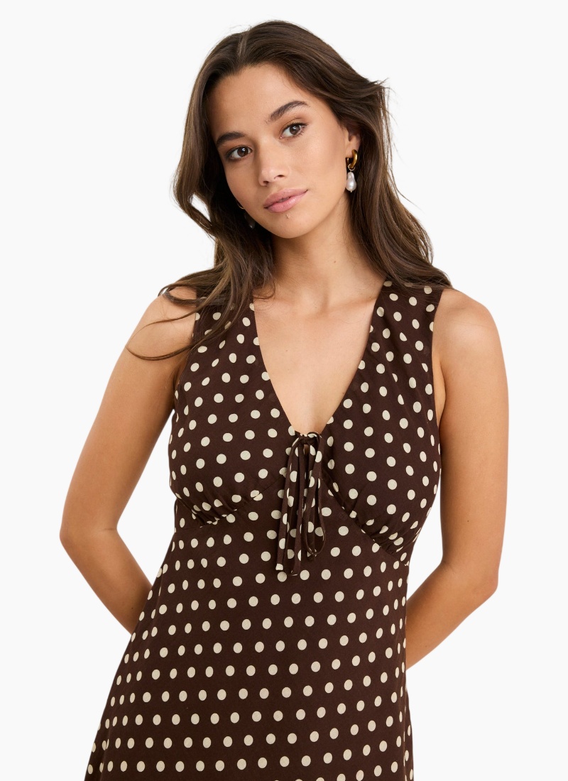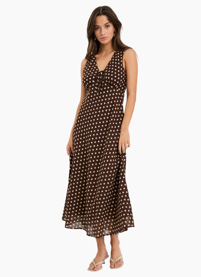 Timeless and playful, the Infinity Dress from Among The Brave is a sleeveless bias-cut midi designed in a rich chocolate base with a classic polka dot print. The V-neckline is finished with a delicate tie detail for a feminine touch, while the bias cut drapes beautifully to flatter the figure. Fully lined for comfort, this dress is crafted from a breathable cotton-linen blend, making it an effortless choice for day-to-night styling.