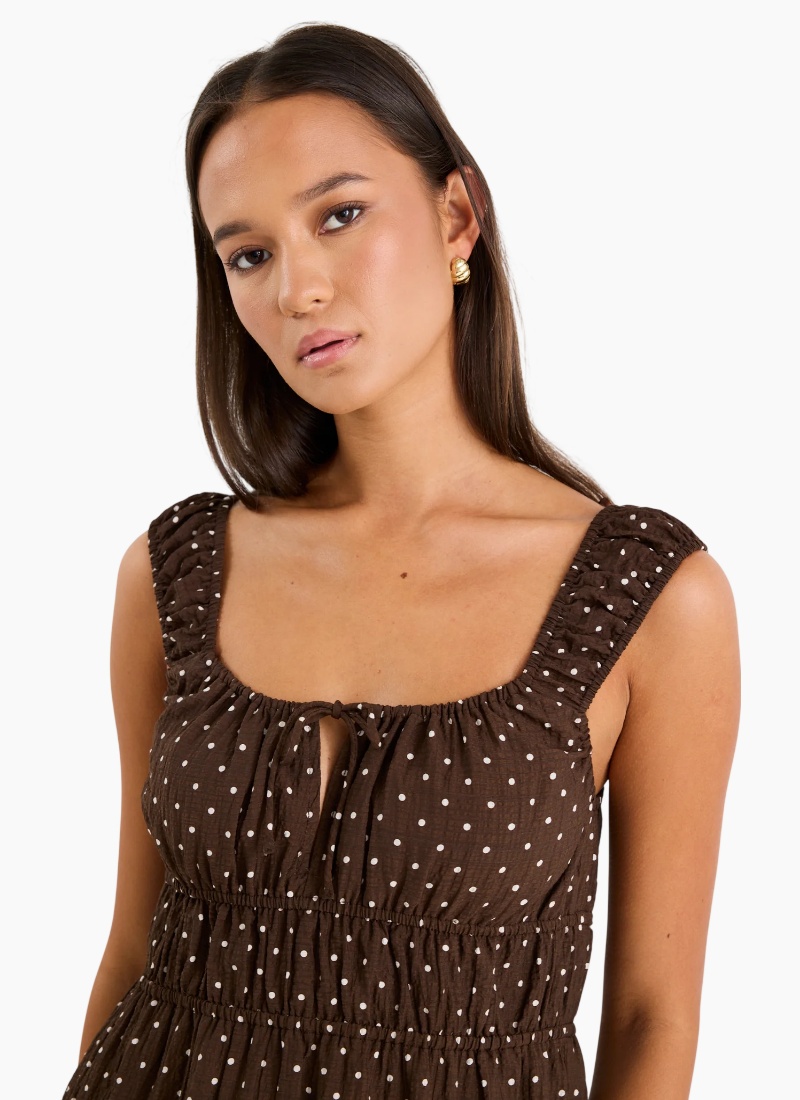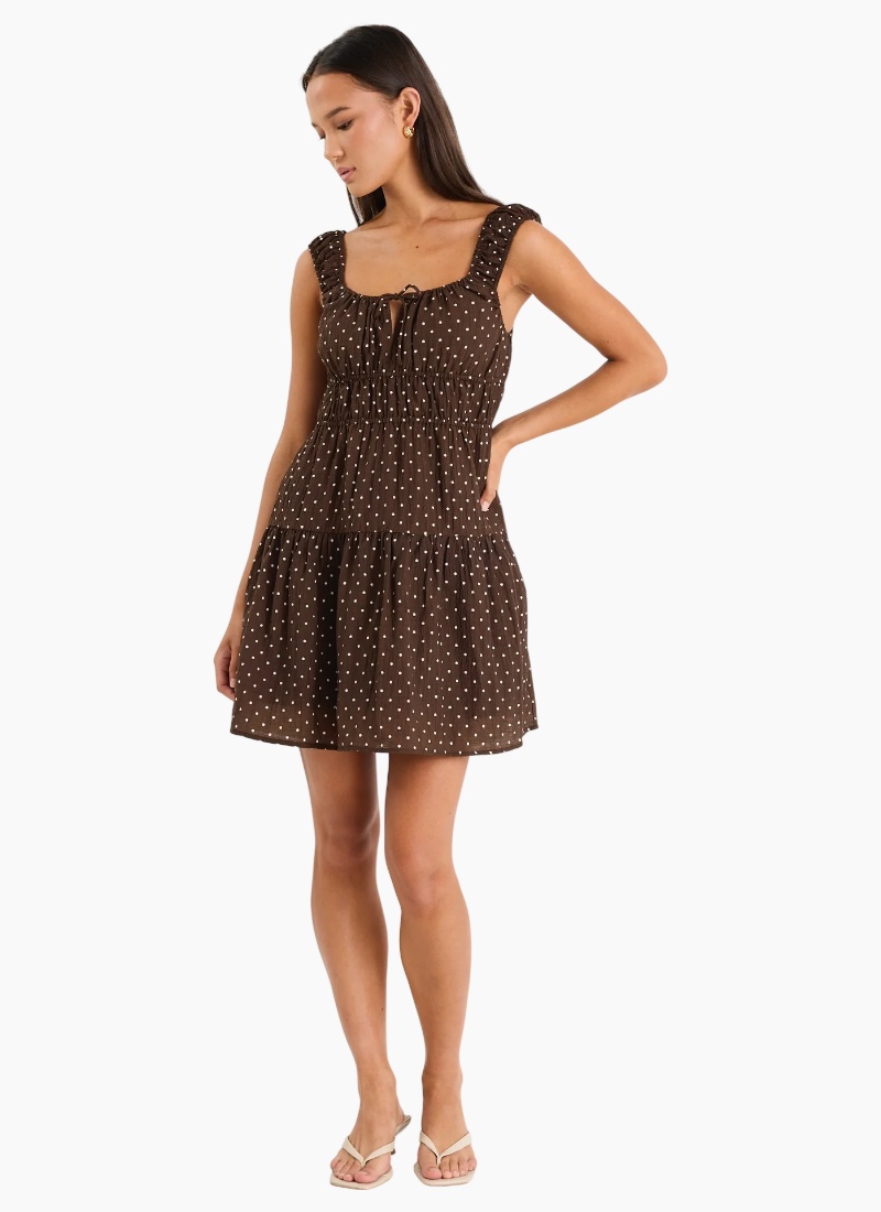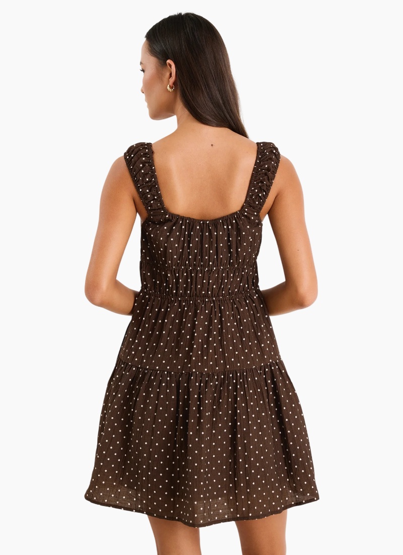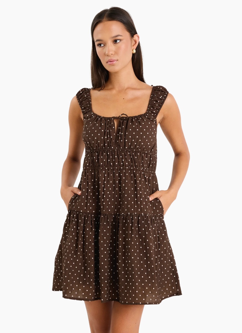 Add a little fun to your wardrobe with the Tricky Chocolate Mini Polka Dot Dress. This dress features a playful polka dot print on a rich chocolate brown base, making it perfect for both casual and dressed-up days. The tiered skirt and ruffled straps give it a feminine, flirty vibe, while the tie-front detail adds a sweet touch. Fully lined for extra comfort and coverage, it’s your go-to for effortless style across the summer season.