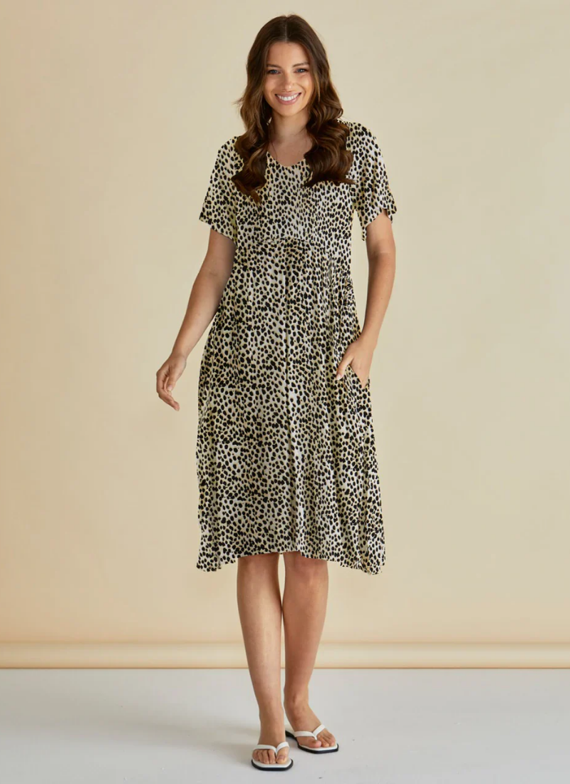 The Donna Dress captures effortless femininity in a refined silhouette. Crafted from soft stretch viscose jersey, it features flutter sleeves, a curved waist seam and gentle gathering for a flattering drape. The relaxed fit moves beautifully with you, offering easy, elevated comfort. A timeless piece that transitions seamlessly through the seasons.