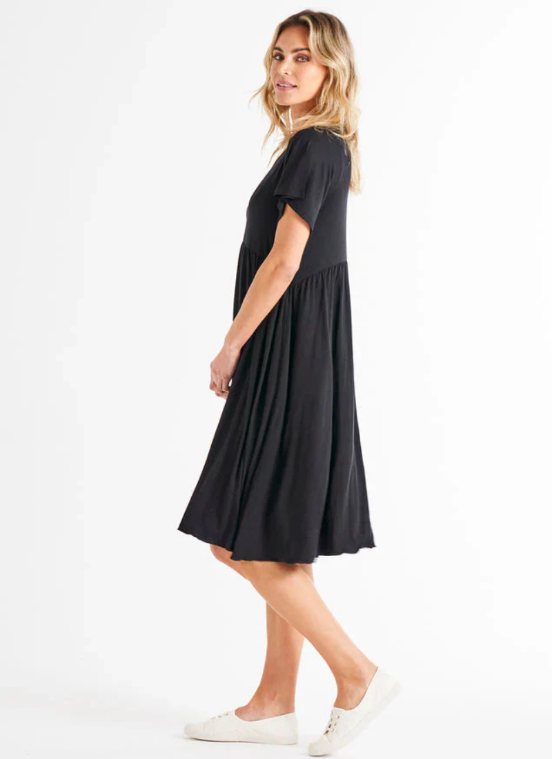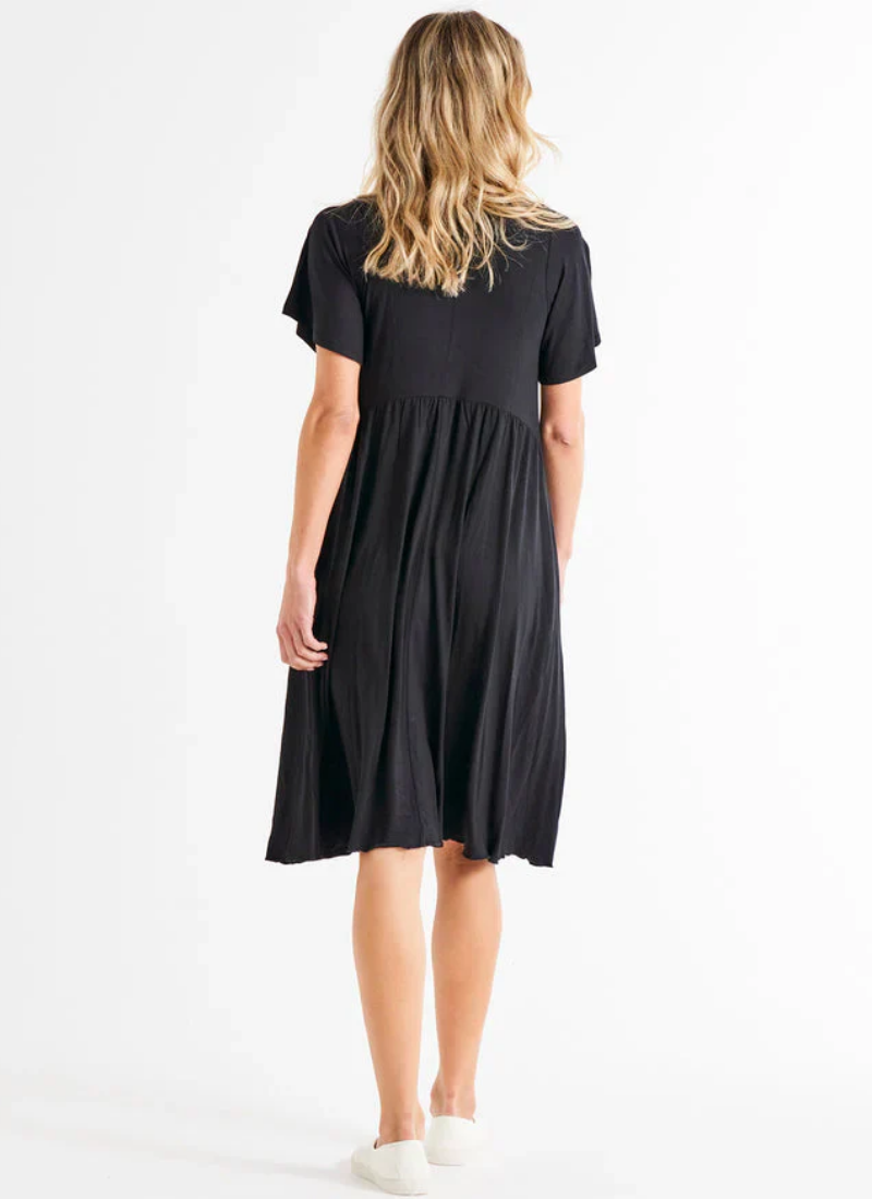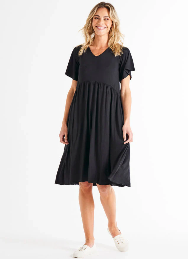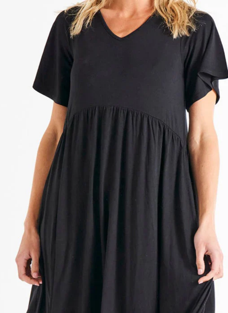 Introducing the Donna Dress - your new favourite for relaxed style and comfort! With a curved waist gathered seam, frill sleeves, and a classic V-neckline, this dress is perfect for those laid-back, fun, and effortlessly chic days. Elevate your wardrobe with the Donna Dress for the perfect blend of fashion and comfort. Curved Waist Gathered Seam. Frill Sleeve. V-Neckline. True to size. Alice wears a size 10. She is 173cm tall and has a 87cm bust, 61cm waist and 89cm hips.