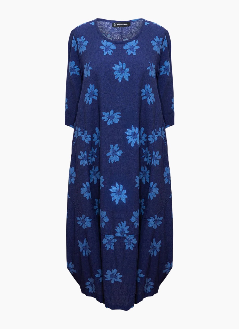 Introducing the Dune Dress from Bittermoon. This relaxed navy linen dress, patterned with painterly light-blue florals, offers effortless daytime elegance.