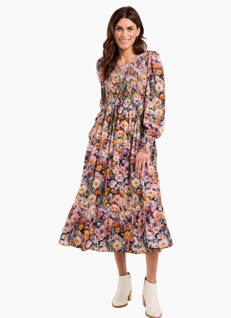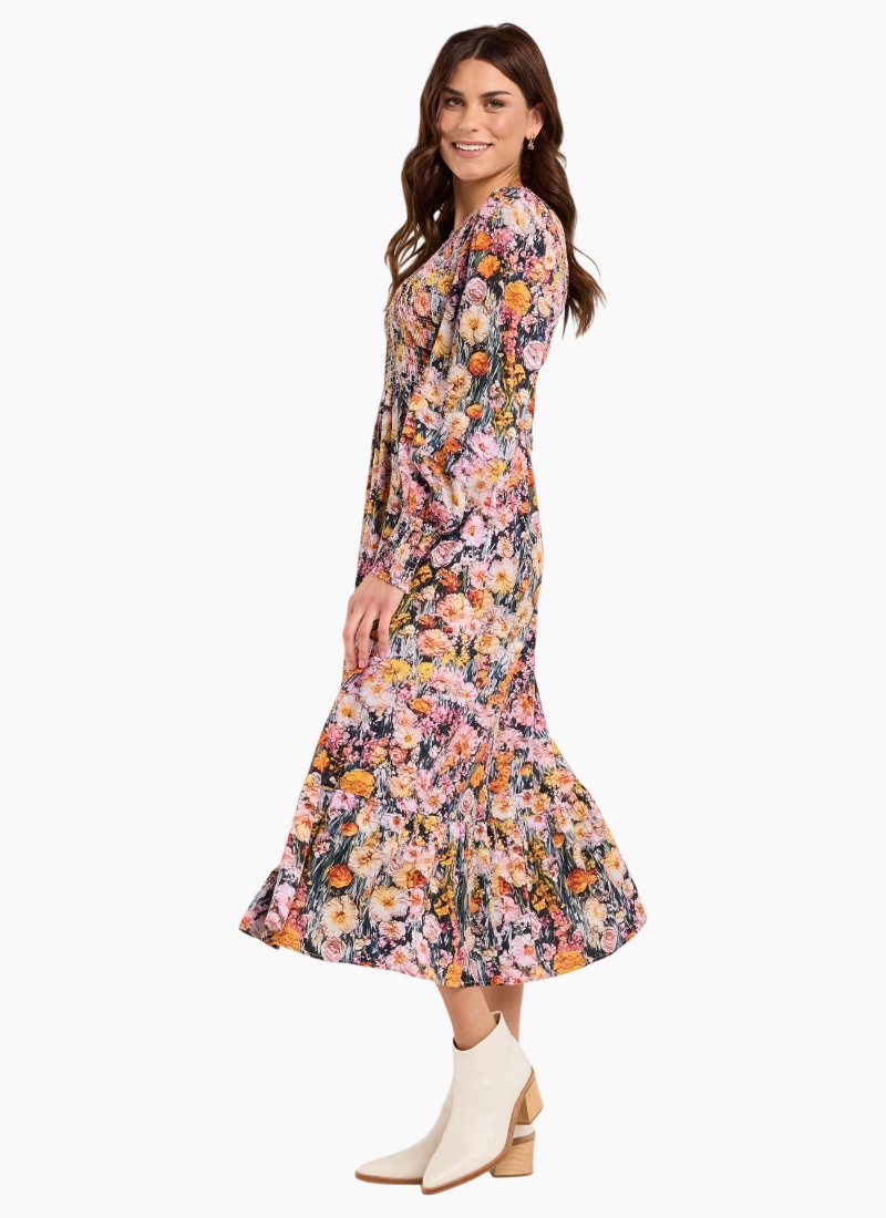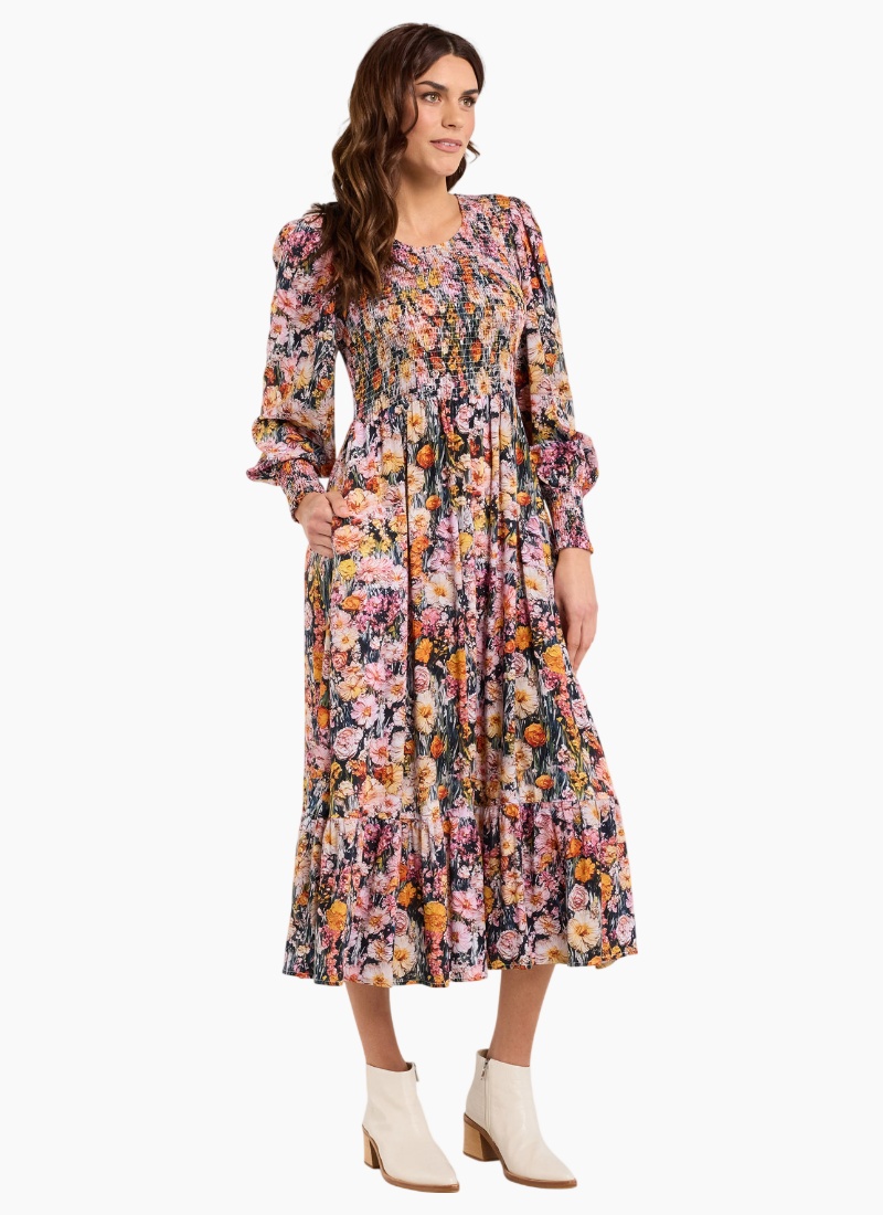 The Charlotte Shirred Dress from Blackstone's is sure to be your new wardrobe staple, effortlessly balancing comfort and style. Crafted from 100% rayon this dress promises a soft flowy feel thats perfect for any day out. Designed in shirred style for a flattering fit it embraces both simplicity and elegance. Featuring all of the colours of the season the Charlotte will be the perfect piece for any occasion. Shirred bodice and shirred cuffs Single wide bottom ruffle Midi length hemline
