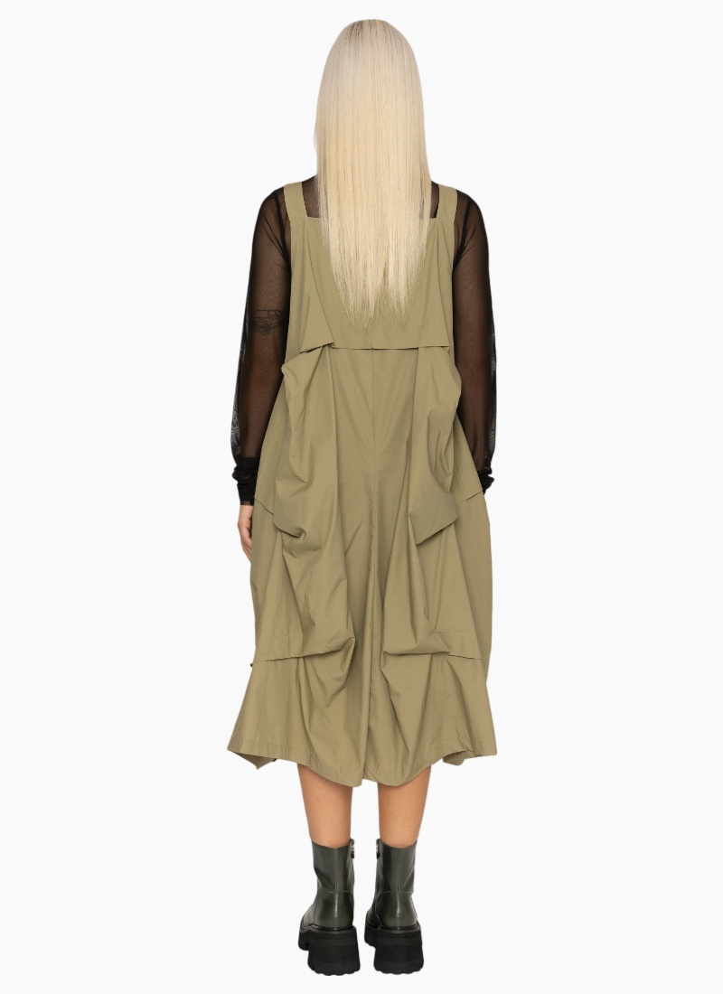 Introducing the 6015 Valen Dress from Bone and Arrow. A contemporary khaki day dress with architectural draping and adjustable straps.