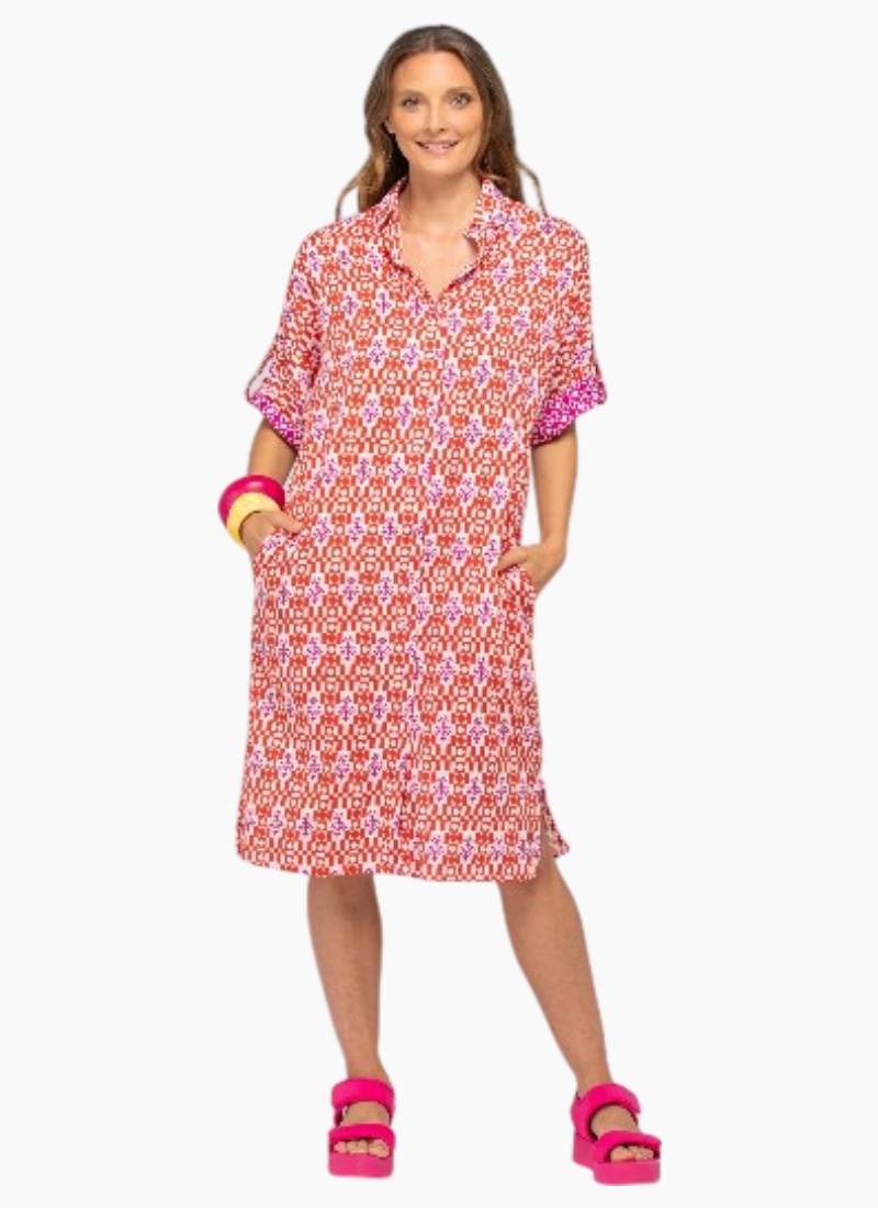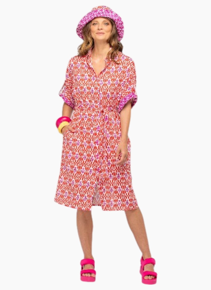 The Boom Shankar Maui Shirt Dress is a relaxed and versatile dress that will see you through beach to brunch in style!100% cotton, covered front buttons, fabric belt tie, structured collar, below knee length, adjustable sleeve length with tabs.
