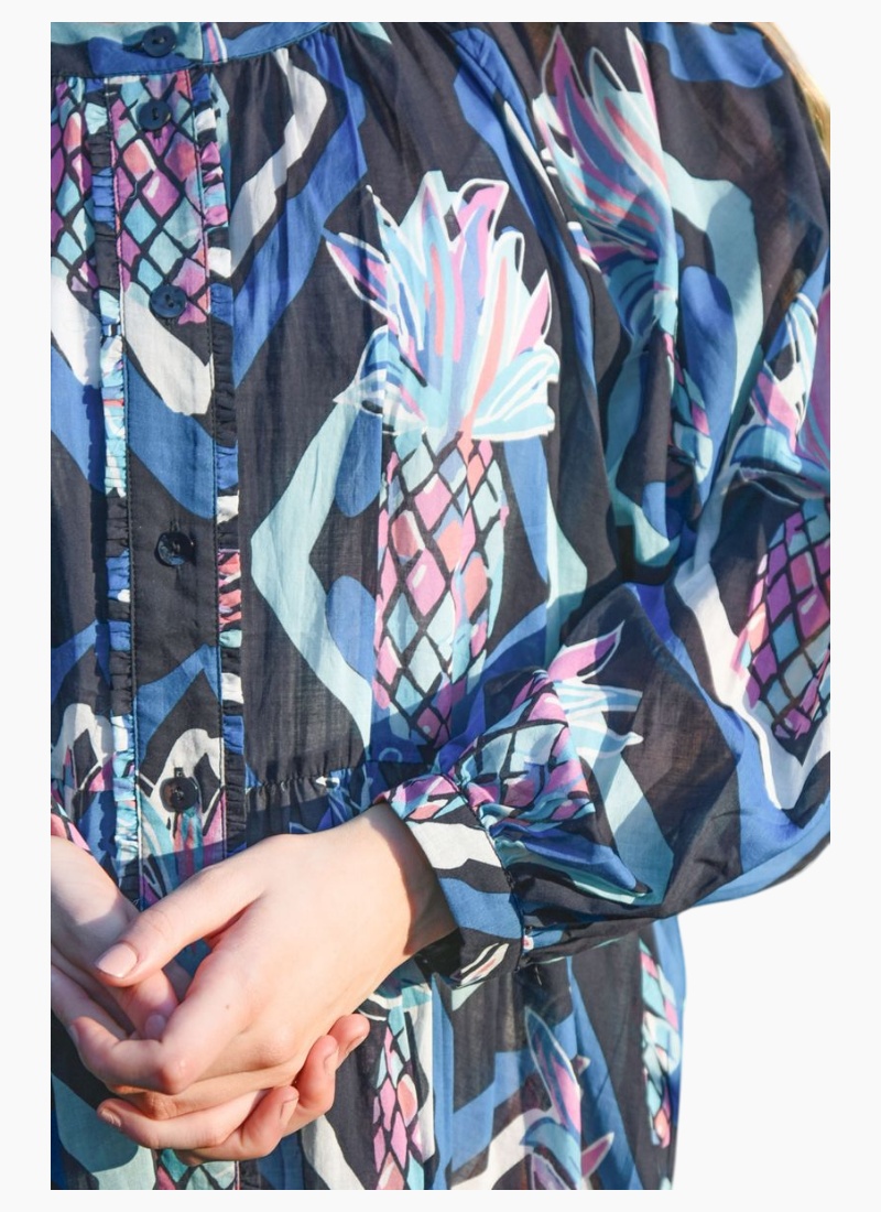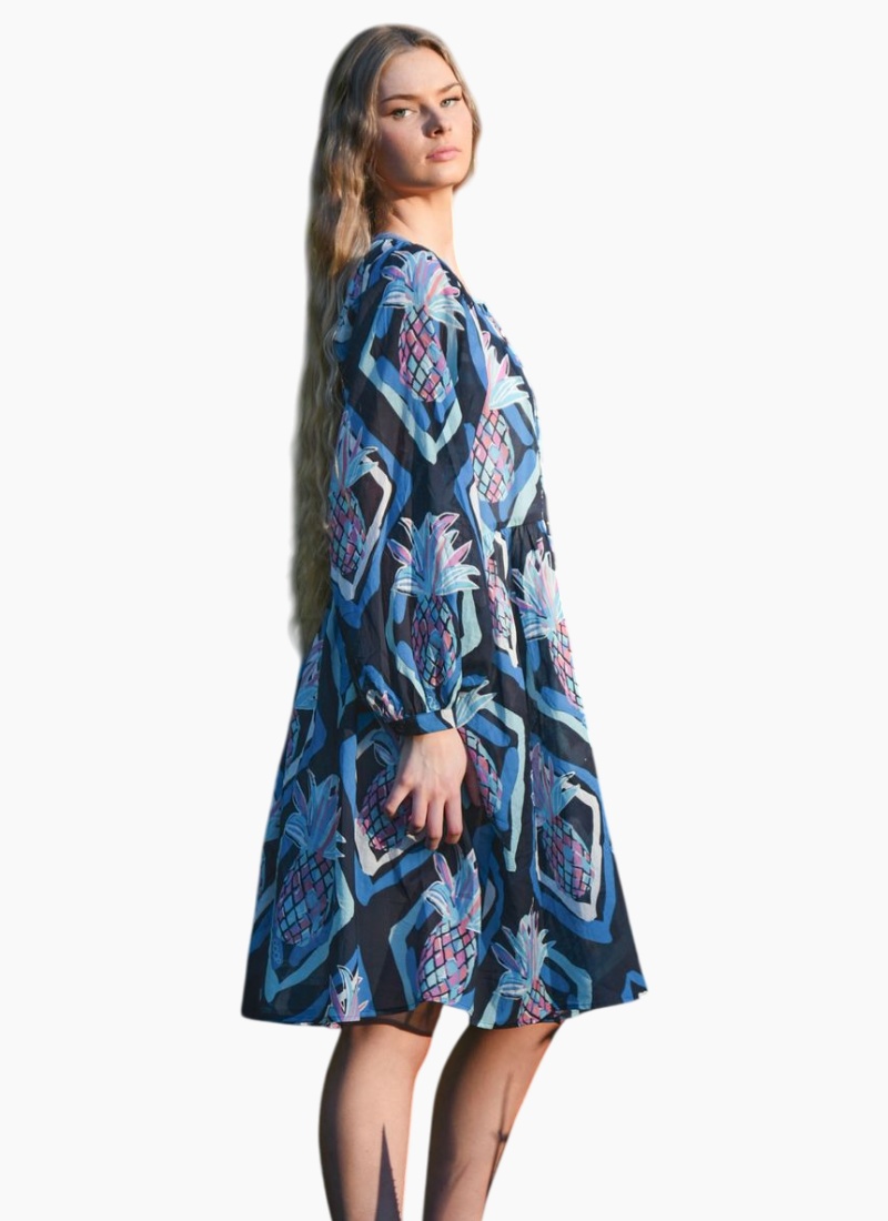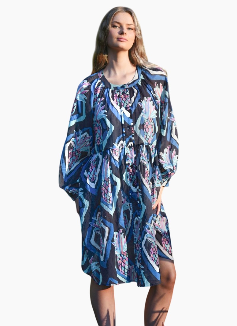 Introducing the BUTTONED UP BLISS DRESS from COOP. A relaxed, artful day dress in a navy, pineapple-inspired print that’s ideal for everyday wear.