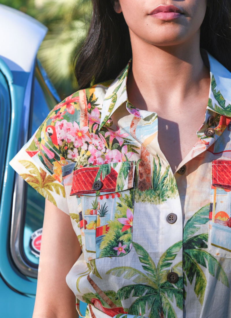 - Cream base with a vibrant tropical multicolour print that brightens your wardrobe