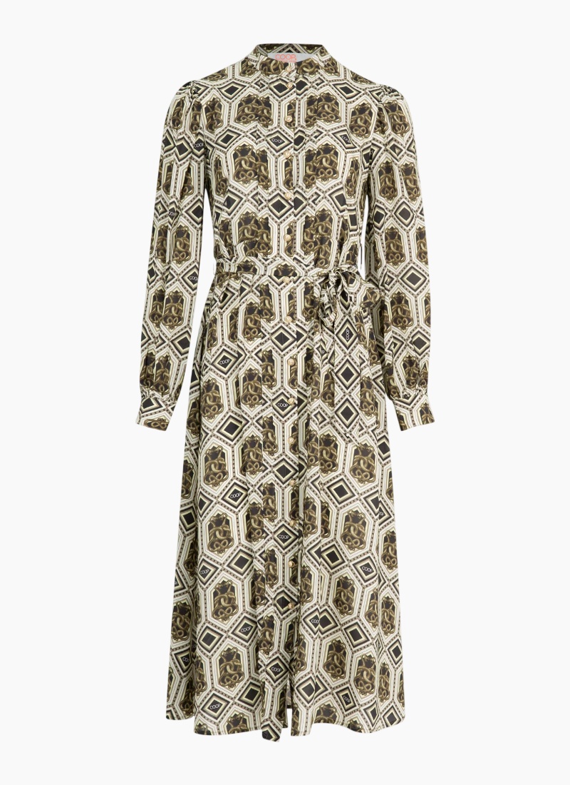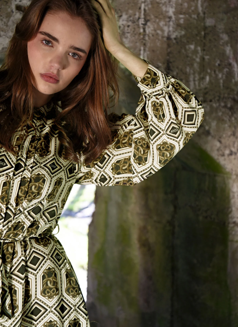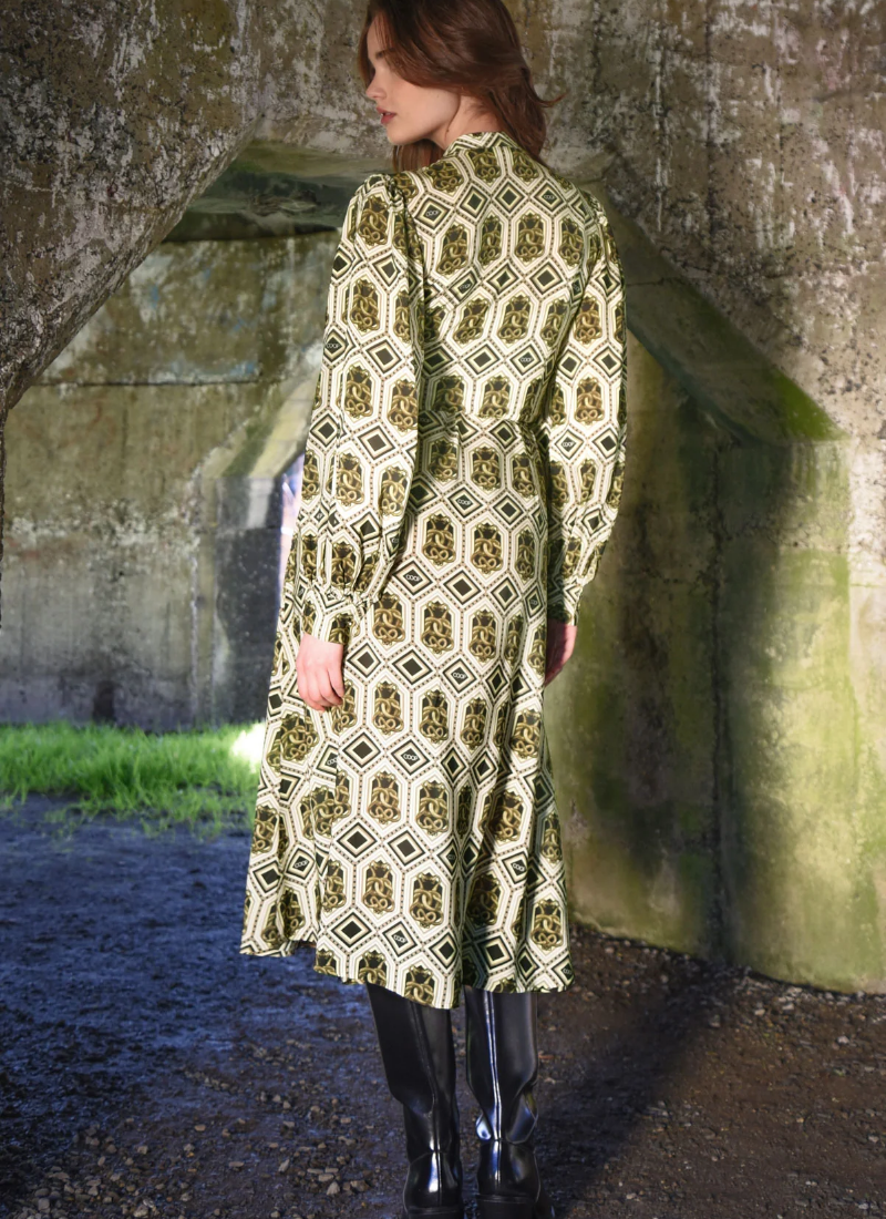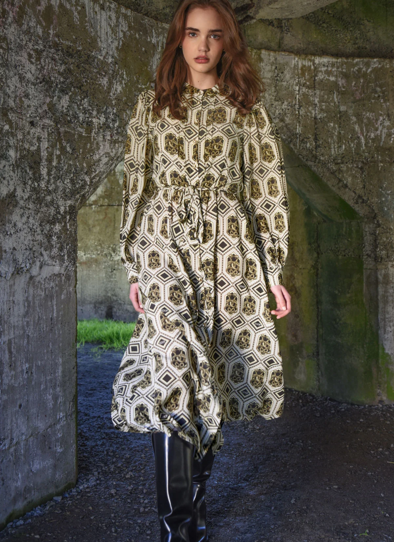 Introducing the Charm Me Dress - Snake Charmer Bronze from COOP. This effortless day dress blends vintage-inspired geometry with modern ease for a refined everyday statement.