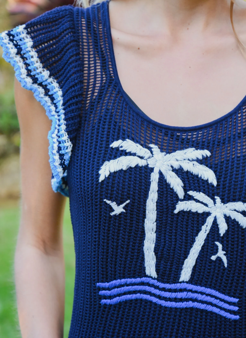 Introducing the Hooked On A Feeling Crochet Dress from COOP. This navy crochet dress brings a breezy, boutique-ready aesthetic perfect for summer days and beachside strolls.