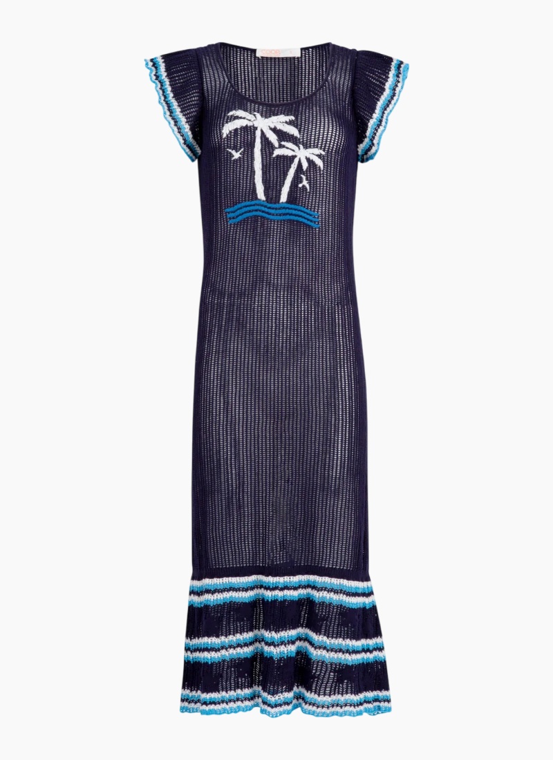- Navy colour with white and blue striped hem and tossed palm motif for a playful coastal touch