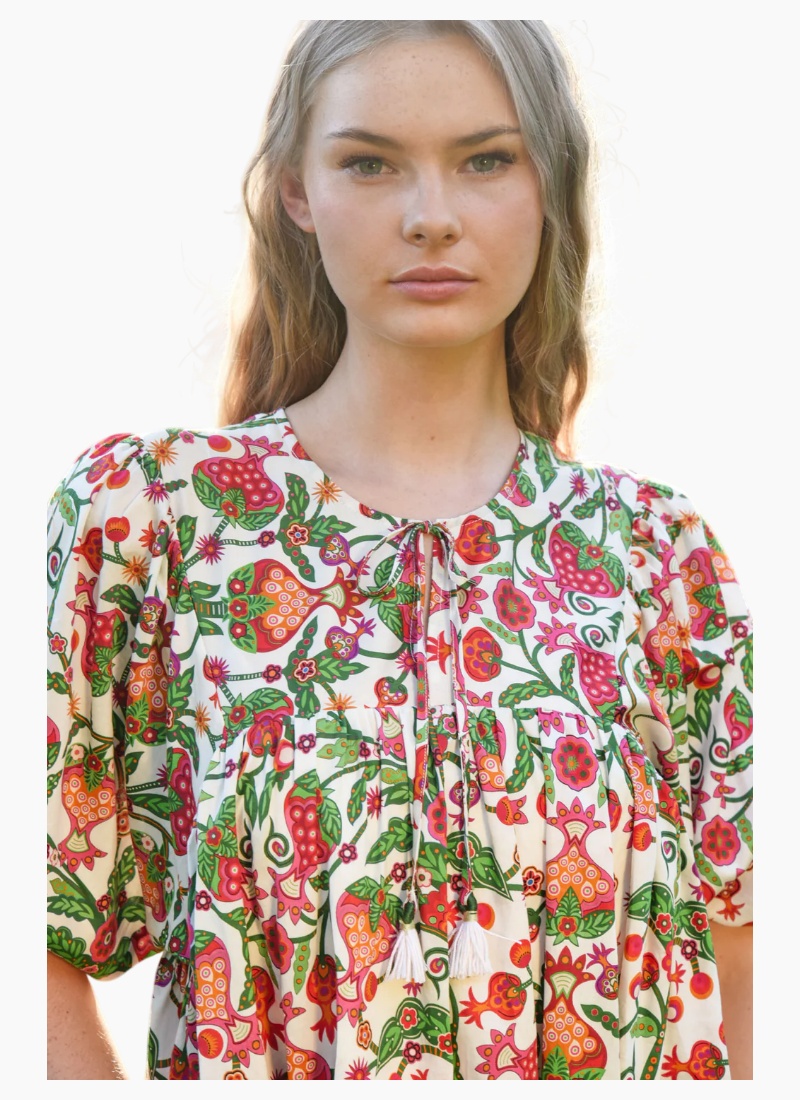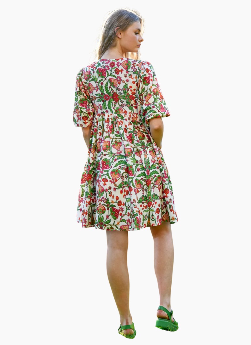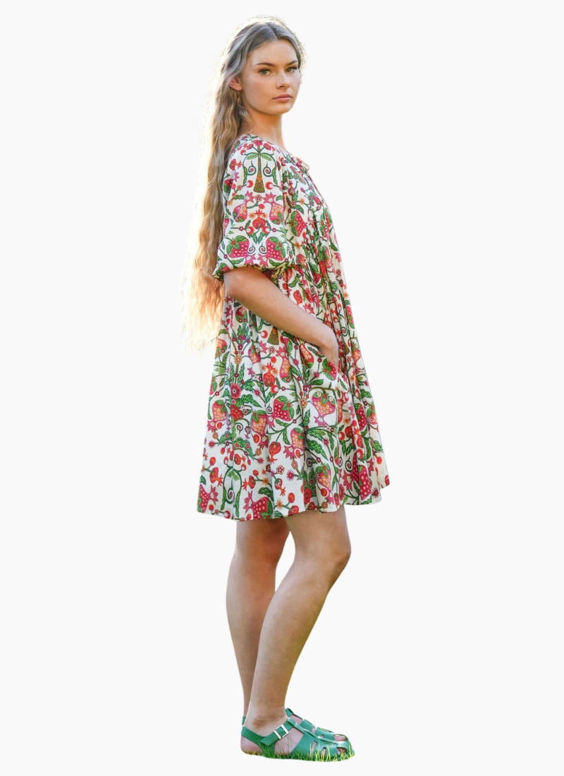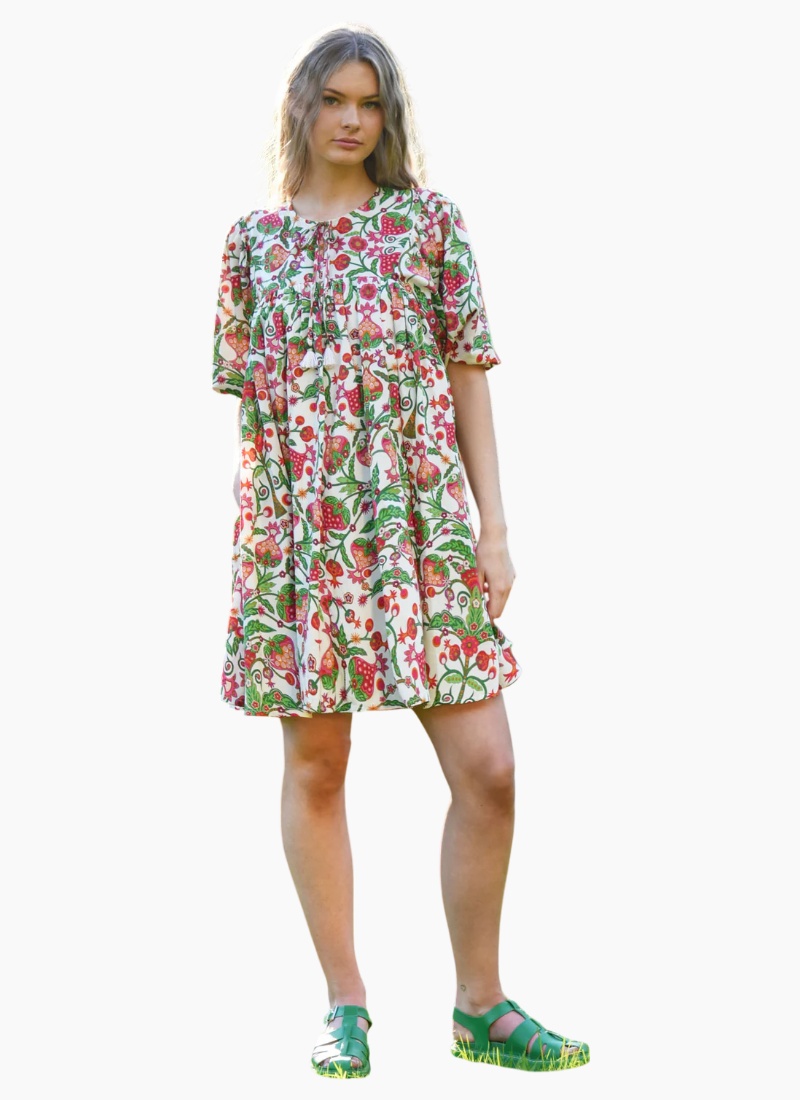 Introducing the SHORT AND SWEET dress from COOP. A breezy, patterned day dress that brings vintage-inspired charm to everyday looks.Details Balancing both a vibrant print and a shorter hemline, the ‘Short and Sweet’ dress is intelligently designed for summer. Crafted in the ‘Berry Good’ cotton sateen, this luxe feeling cotton is gathered from the yoke, creating a whimsical baby doll silhouette. Complimented with puff sleeves and a demure neck tie, this dress is a summertime must-have. • Notched neckline with tie • Gathering from yoke • Side pockets • Elasticated cuffs Composition & Care Composition: 100% Cotton Care: Cool hand wash or gentle machine wash. Wash inside out. Do not bleach, wring, rub, soak or tumble dry. Light spin. Line dry immediately in shade. Cool iron on reverse. Dry cleanable. Size & Fit Model is 176cm tall Model wears a NZ 8/ NZ S/ EU 36/ US 4 Garment Bust Measurement: 48cm (S/8)