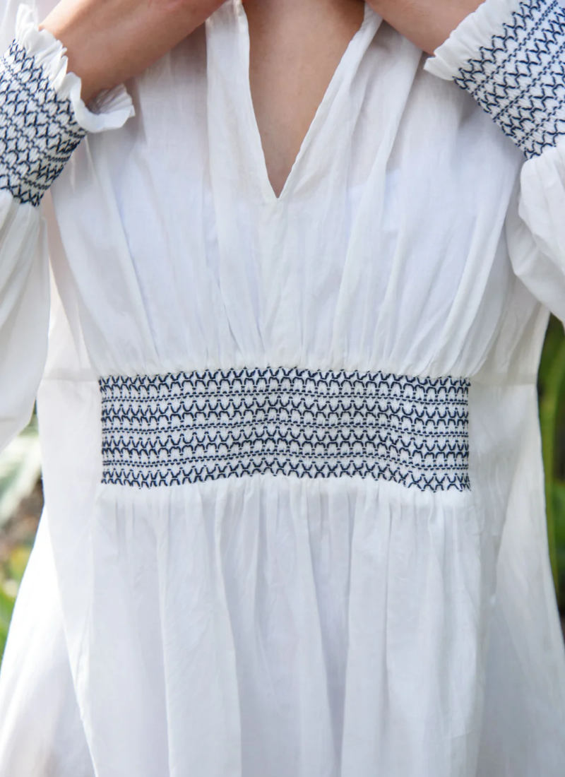 - Smocked waistband and cuffs with navy contrast stitching add subtle texture and shape