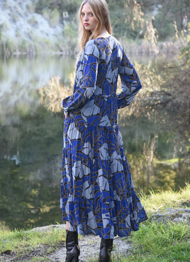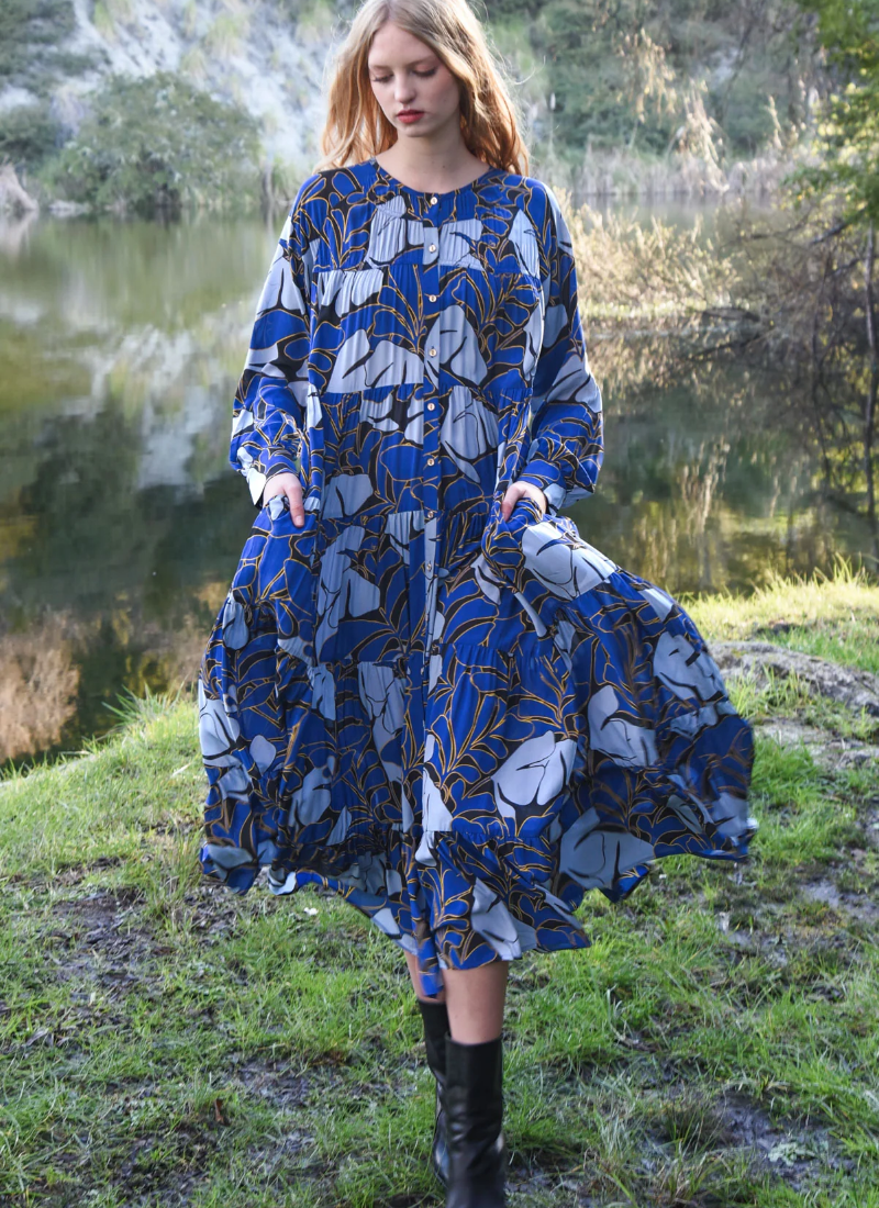 Introducing the SWAY ALL DAY Dress - Leaf it To Me Dress from COOP. This is a fluid, printed blue day dress designed for effortless movement and everyday elegance.