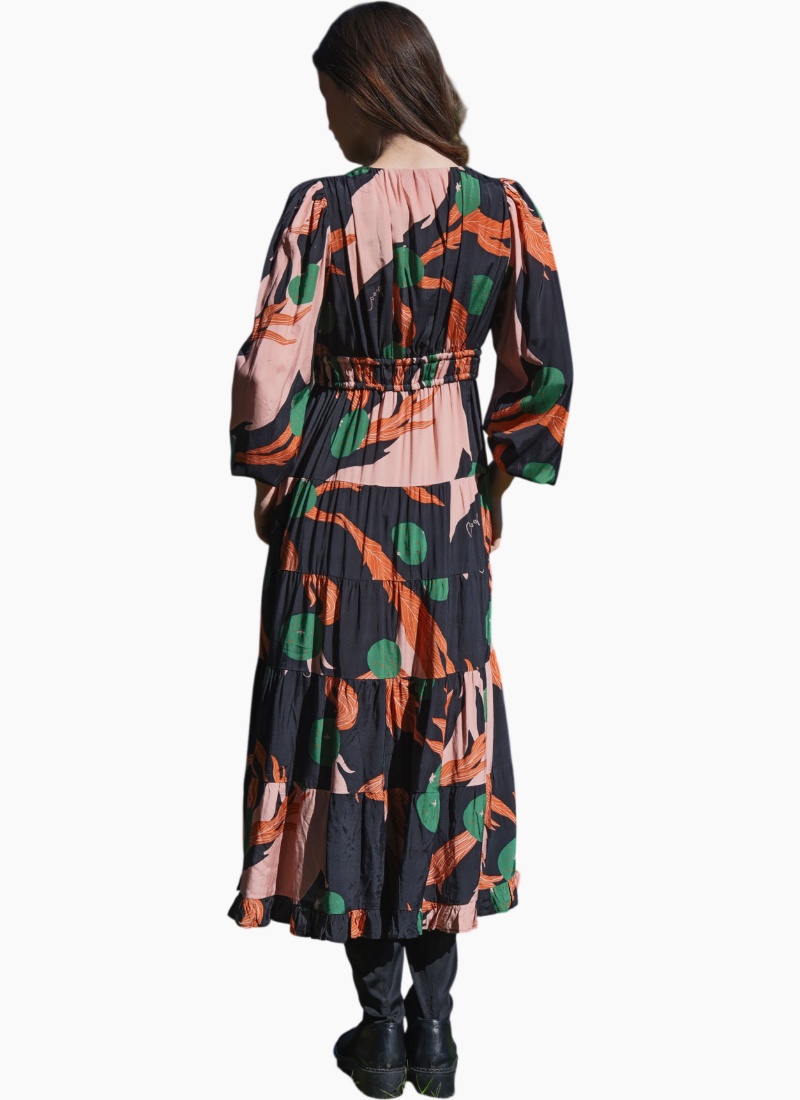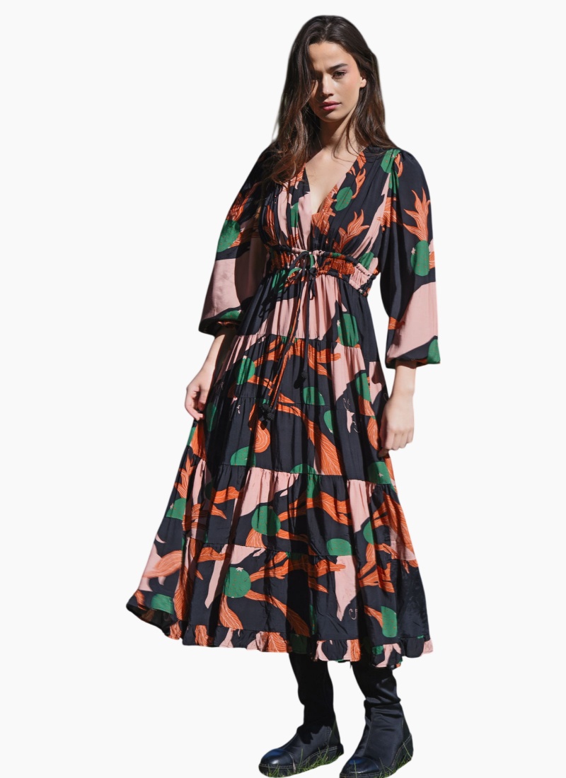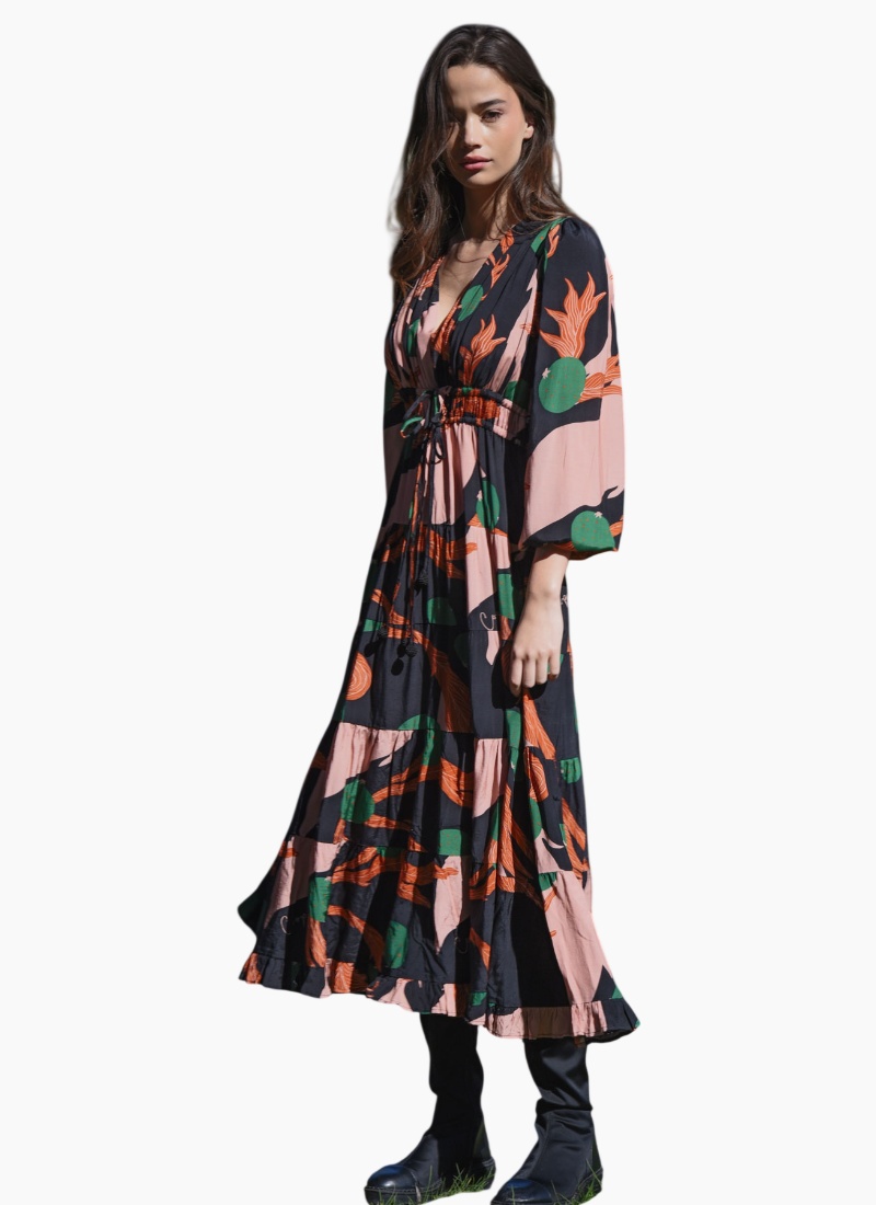 A bold abstract print sets the tone for ‘The Ruche Is On’ dress in 'Berry Unexpected' viscose blend. Framed by a flattering V-neckline, it features a double drawstring waist for adjustable shape, blouson sleeves with elasticated cuffs, a softly tiered skirt, and side pockets for effortless, everyday ease. • V-neckline • Double drawstring waist with ball tie ends • Blouson sleeves with elasticated cuff • Tiered skirt • Side pockets • Print placement may differ