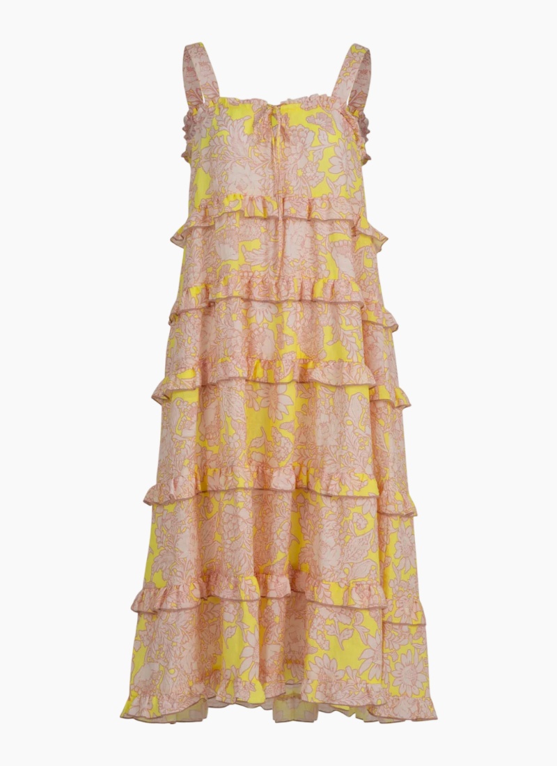 - Tiered ruffle midi silhouette with straps and a subtle tie at the neckline for easy shaping