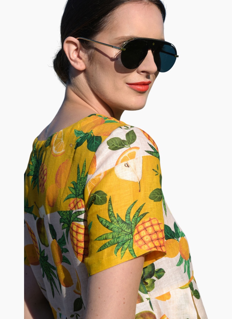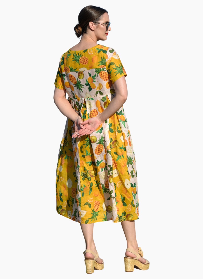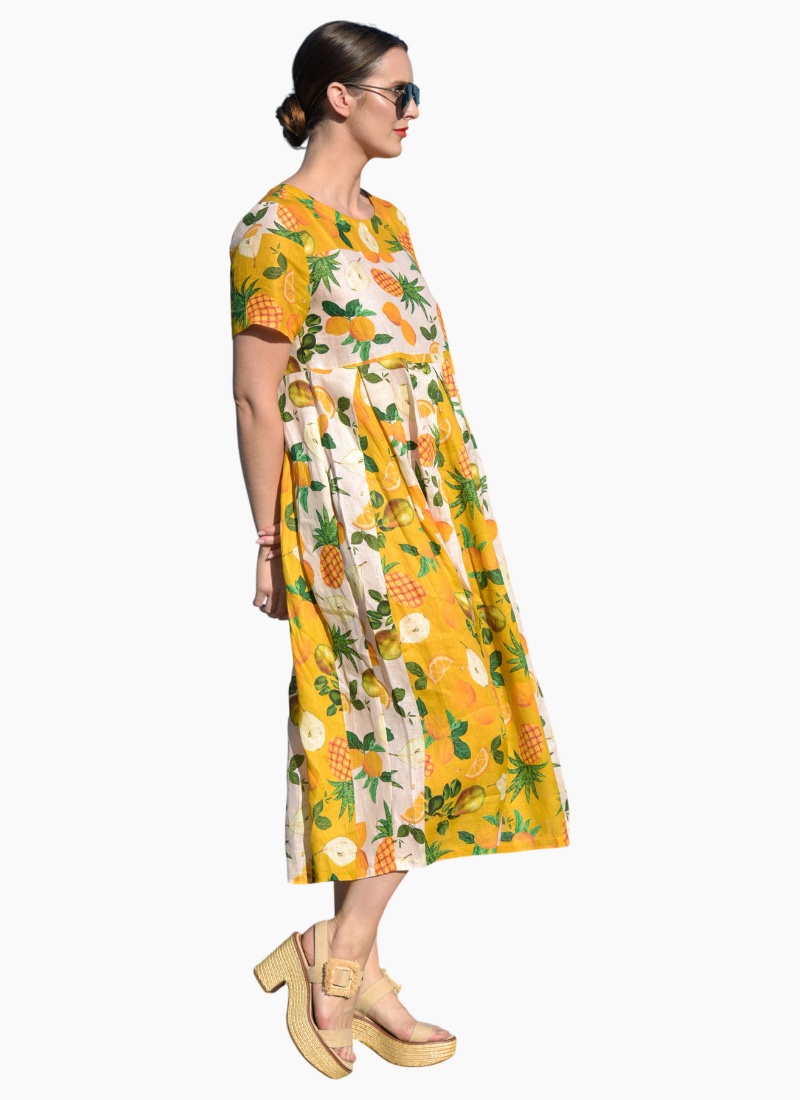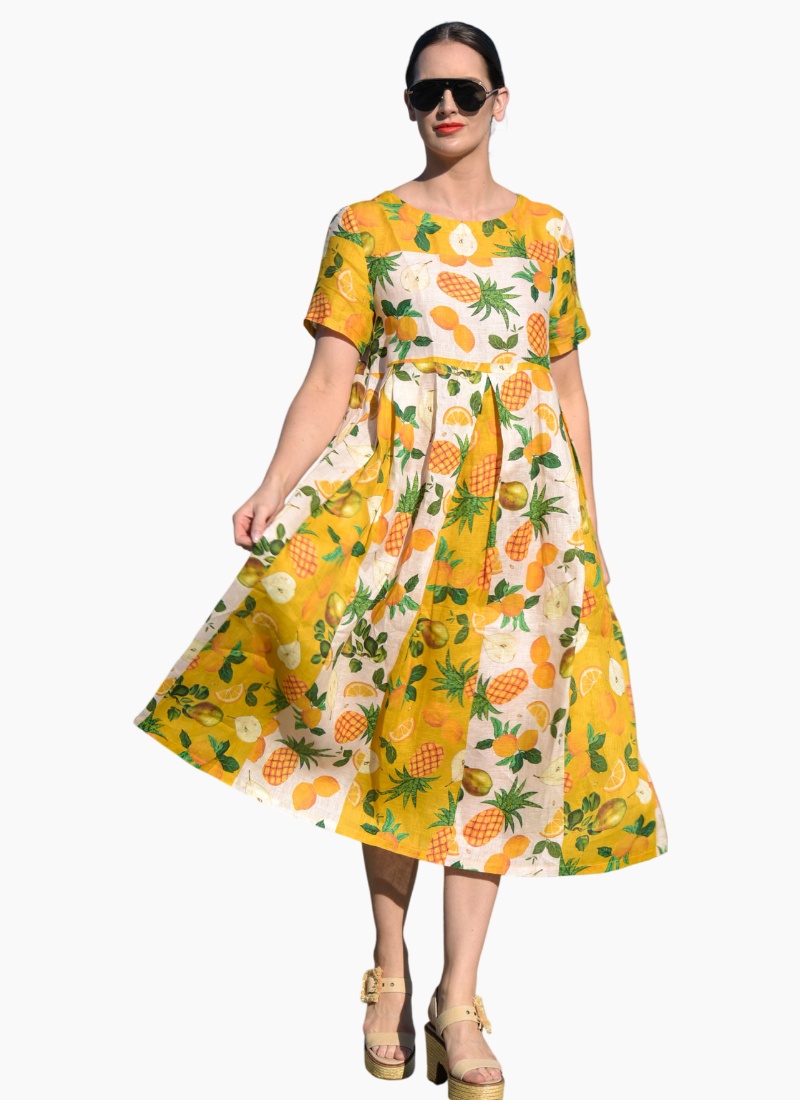 Pack a tropical punch with the spliced ‘Fruit Burst’ printed linen showcased in the ‘Straight Talk’ dress. Sporting a simple cut with a relaxed fitting bodice and pleated skirt this pull-on dress makes summer dressing a breeze. Pair with wedged espadrilles to take this dress from day-to-night. • Pull-on style • Pleated waist • Side pockets CT5796-07VIN
