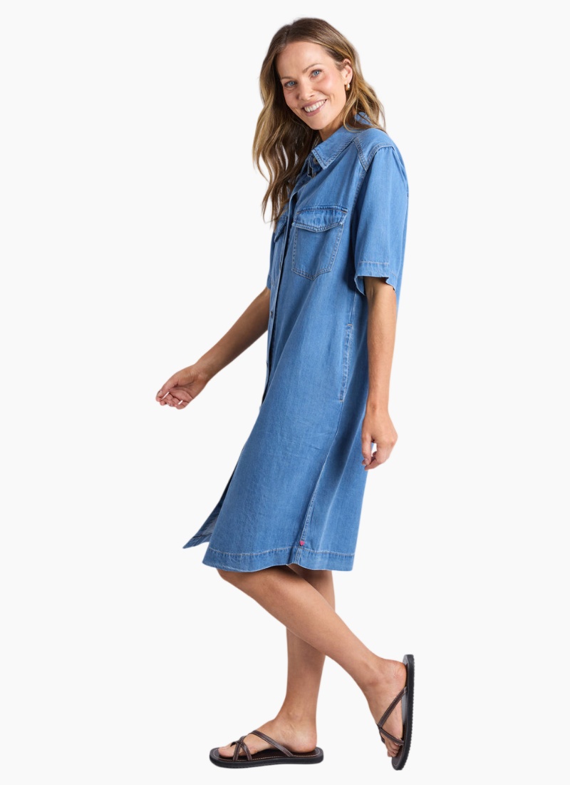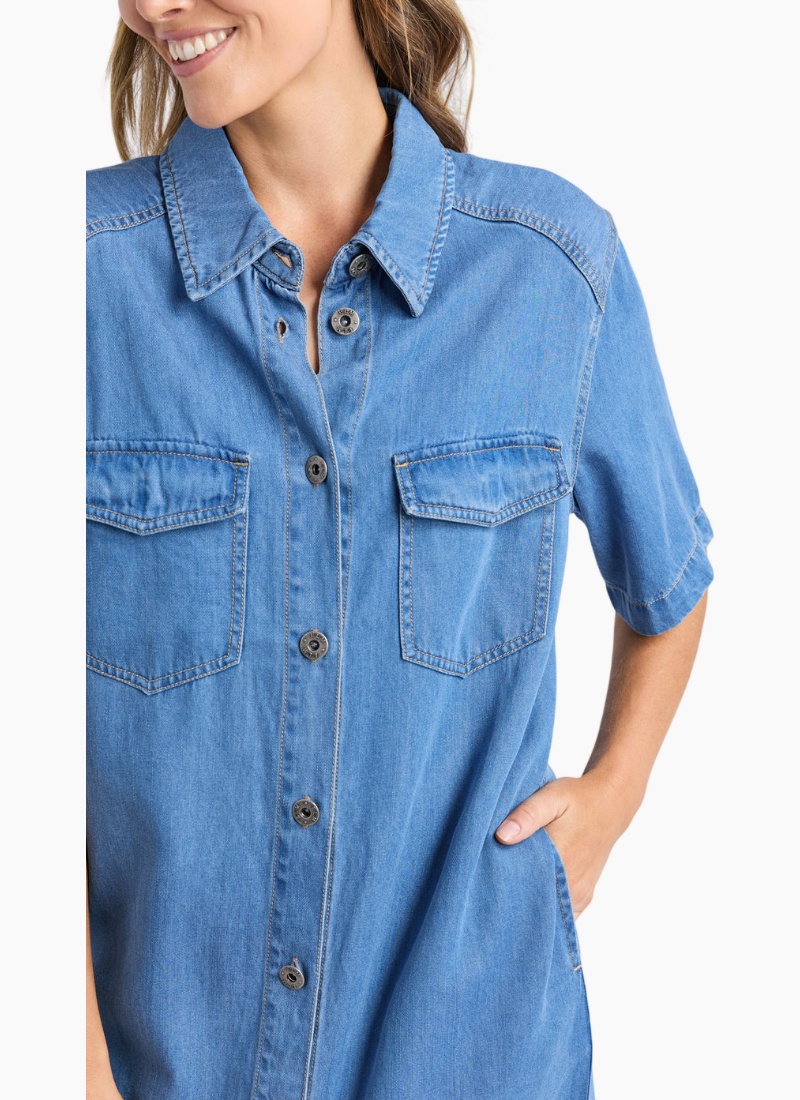 A classic shirt style, lightweight denim dress for the ages. This timeless piece is an easy throw-on and go piece that you'll be wearing on repeat. Shirt dress silhouette with a classic collar. Full-length button-through front closure. Short sleeves. Two functional chest patch pockets with flap closures. Practical side pockets for convenience. Contrast stitching details throughout. Relaxed fit