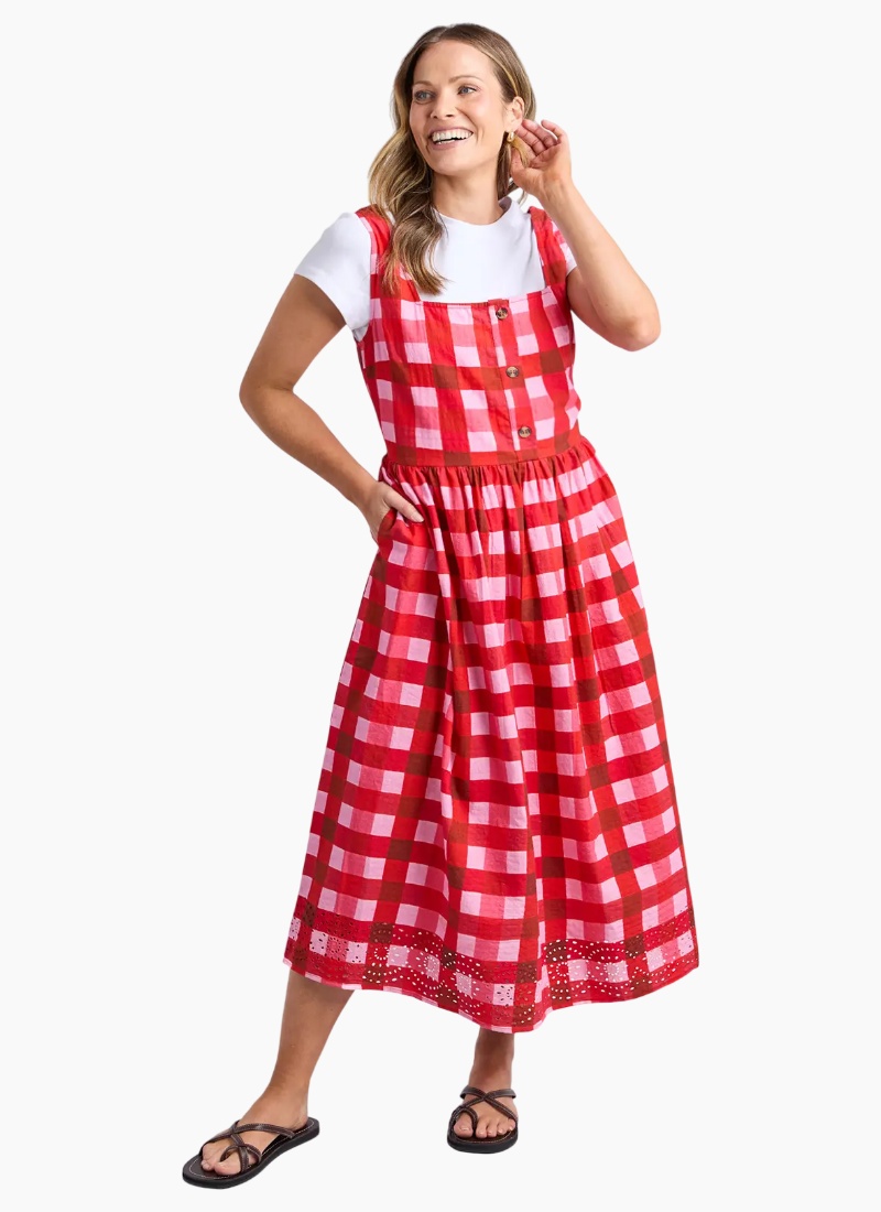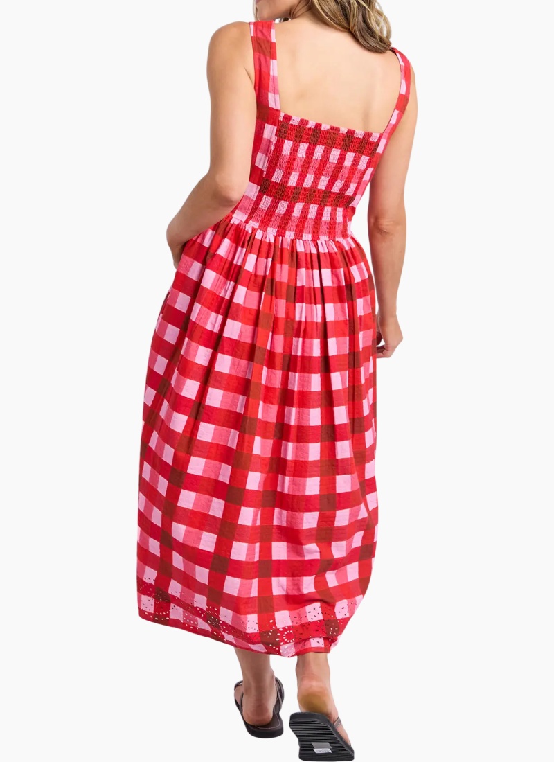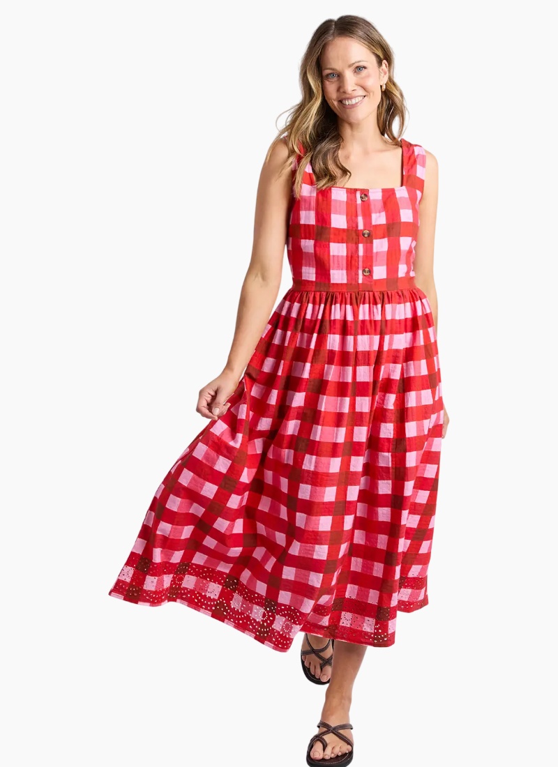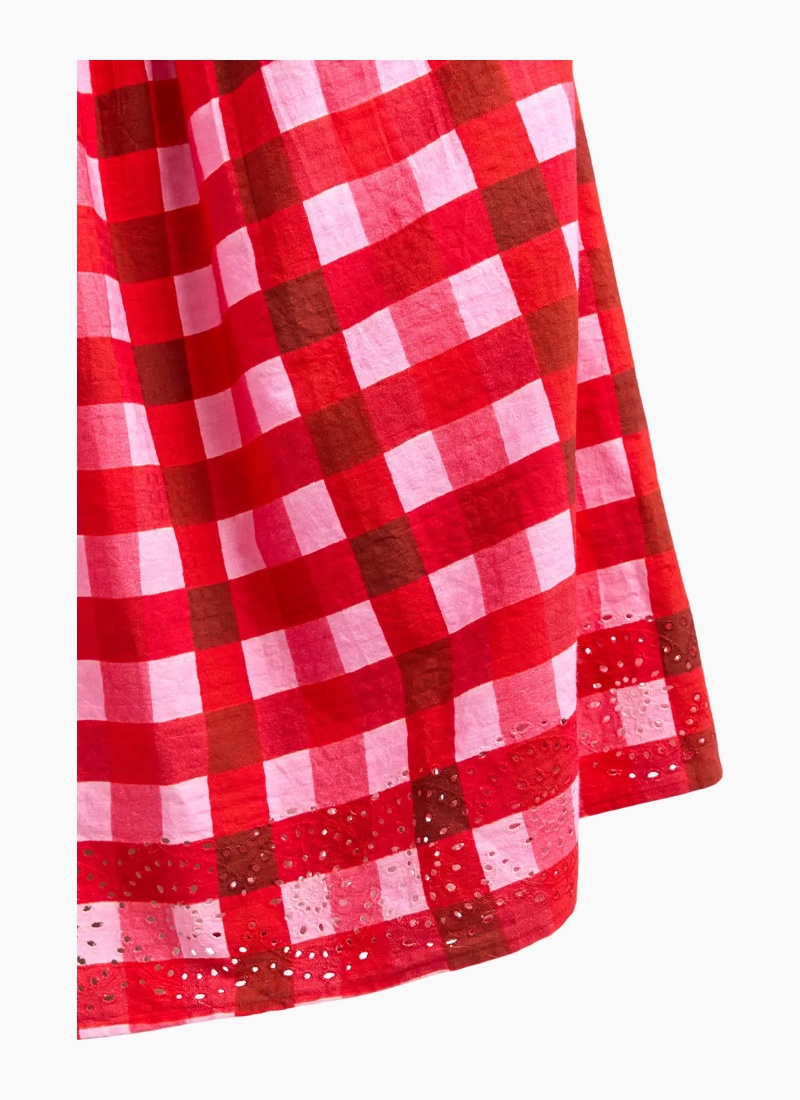 - Poppy red and pink gingham check with delicate broderie eyelet trim at the hem for a feminine finish