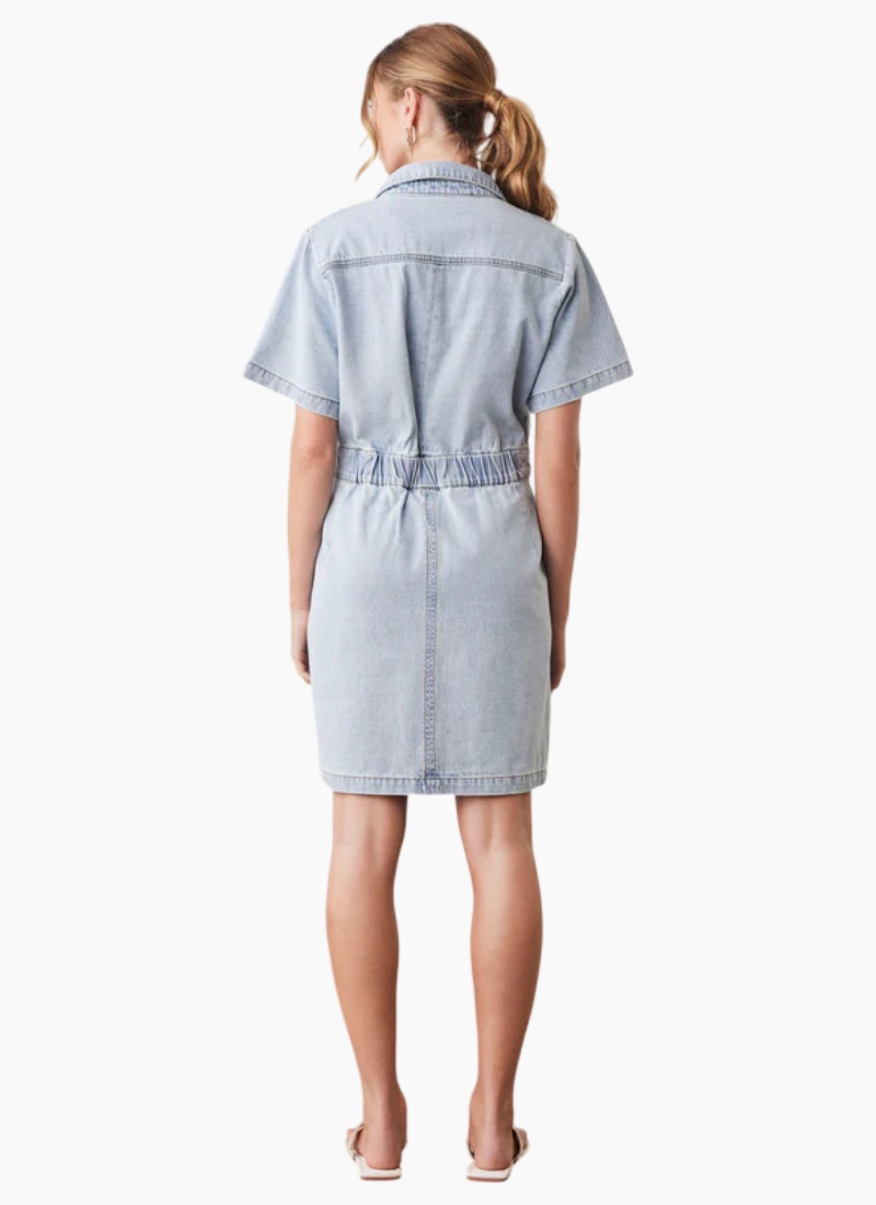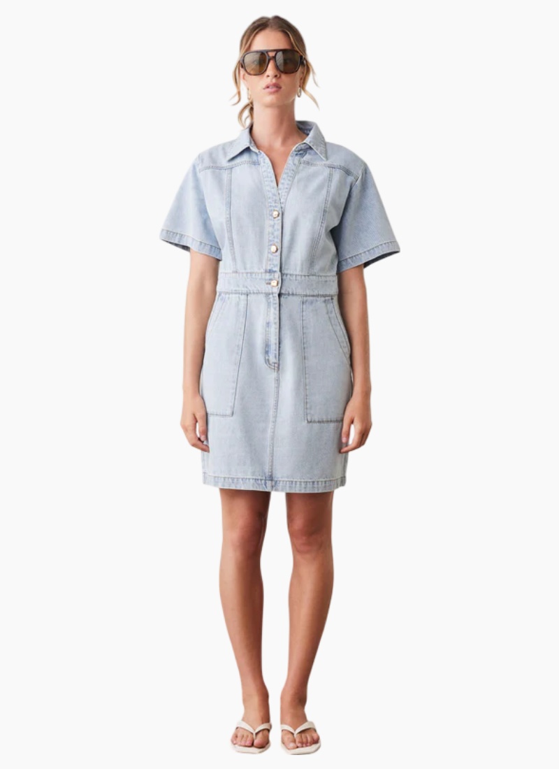 Introducing the Riptide Denim Dress from Esmaee. This light blue denim day dress blends easy-going comfort with polished detail for effortless everyday style.